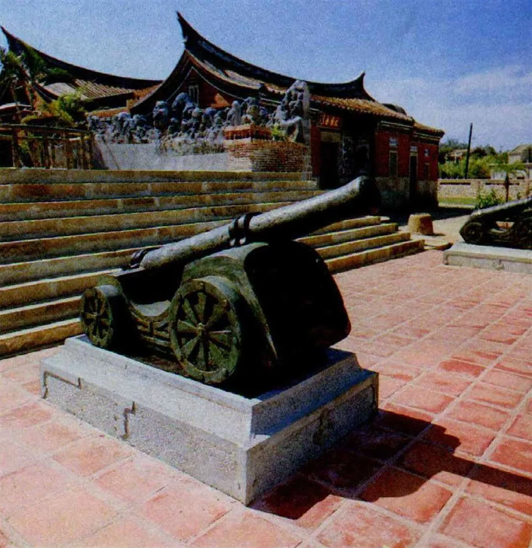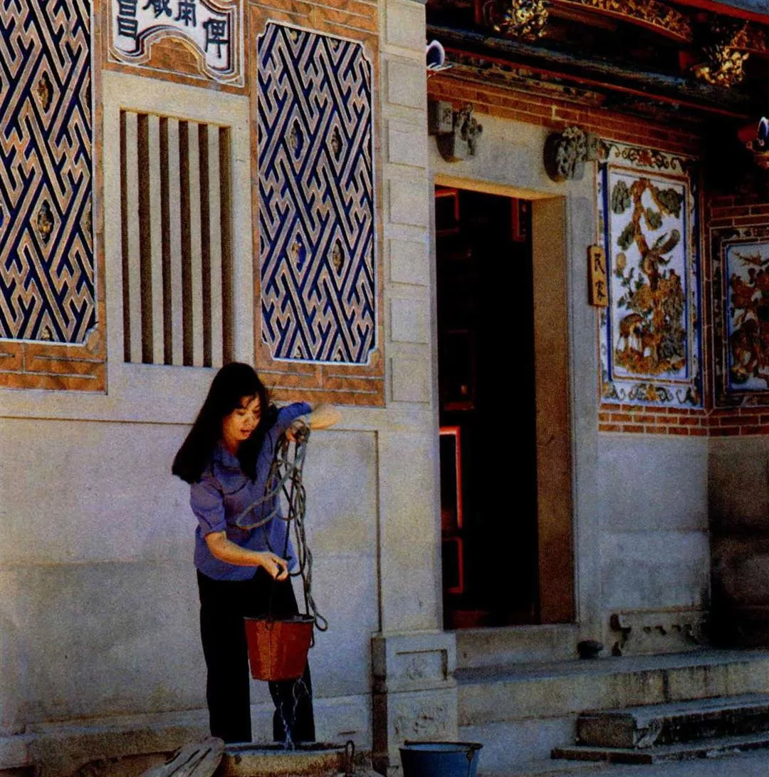 1. The horse-back ridge shows that the ancestors of householders were lower in the social ladder. 2. Two old cannons placed in front of Hai Chu Hall. 3. The well water is slightly tainted with sea water. 4. Antiques exhibited at the Folk Arts Exhibition Hall. 5. Colored pottery fragments are used to decorate walls in Kinmen. 6. Each house is joined with another by similar gates. 7. A girl drawing water from a well.