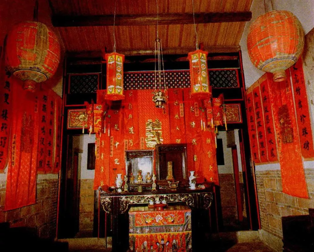 The sacrificial hall houses effects associated with ancestor worship. The ceremonial hall, using a traditional wedding ceremony as its motif, comprises a main hall, nuptial chamber, rooms for the bride's and bridegroom's relatives and the sedan.