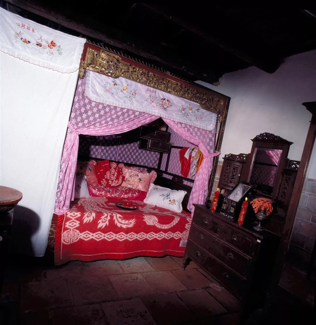 In the nuptial chamber, there is a well-maintained antique four-poster bed with a wood canopy and curtains. Drawers and shelves are attached to the bed for handbags, bed quilts, jewelry and money to be placed. The bed frame is decorated with auspicious patterns to give a warm and romantic air.
