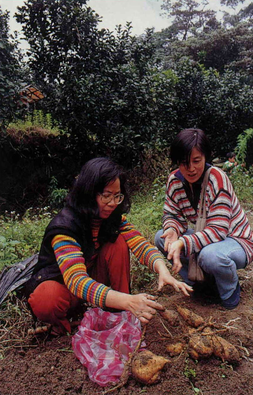 (left, right) Whether it be by making a trip to a suburban "tourist" farm to dig sweet potatoes or by gardening on the roof of their own apartment building, city-dwellers "steal a half day of leisurely drifting on life's waters," getting a rare taste of country life.