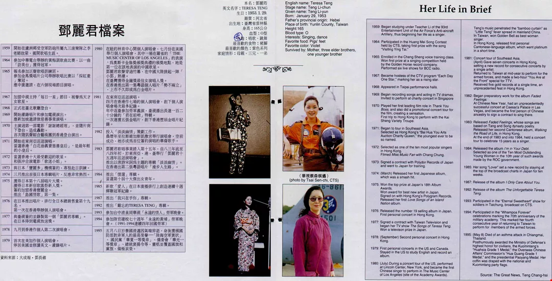 The singer is gone, but her songs float through the air. She leaves behind posthumous glory and fanfare, and countless grieving fans. Teresa Teng is by no means forgotten. On main thoroughfares and in little lanes, in supermarkets, in record stores, in taxicabs.... everywhere you turn you can hear her sweet voice resonating: