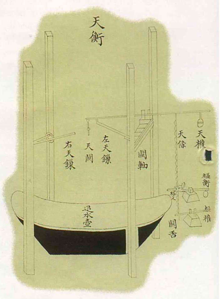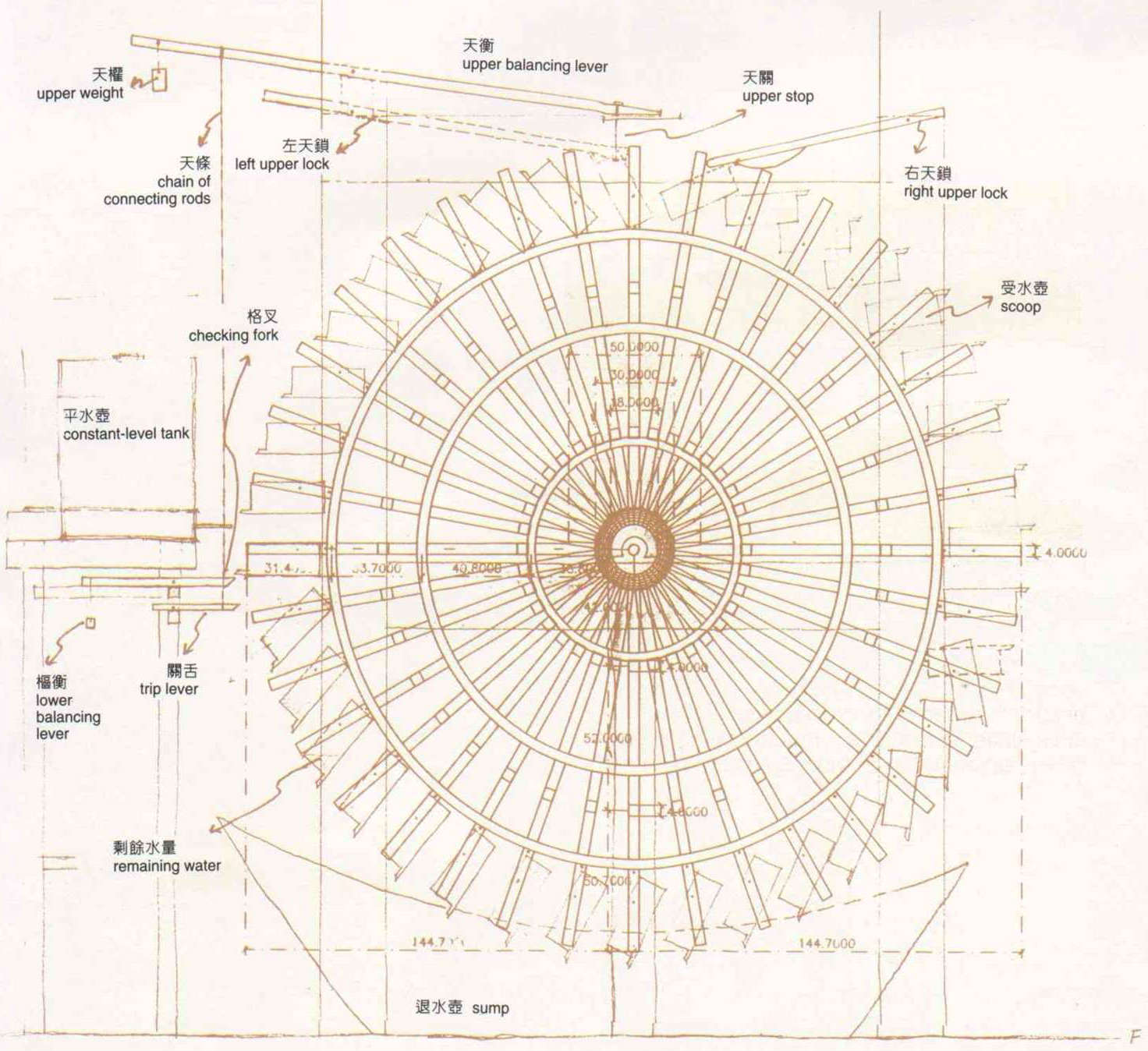 Su Song used a system of balancing levers as an escapement to make sure the drive wheel only turned by one scoop at a time. But his diagram is so simplified that it left most later readers baffled. (courtesy of the National Palace Museum)