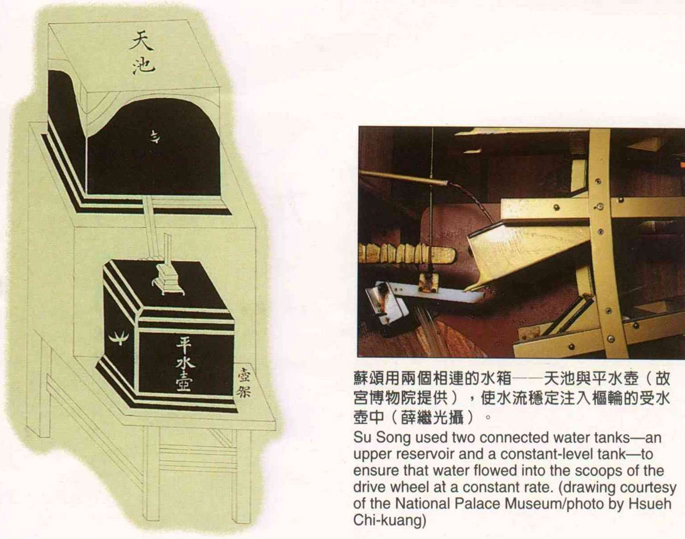Su Song used two connected water tanks--an upper reservoir and a constant-level tank-to ensure that water flowed into the scoops of the drive wheel at a constant rate. (drawing courtesy of the National Palace Museum/photo by Hsueh Chi-kuang)