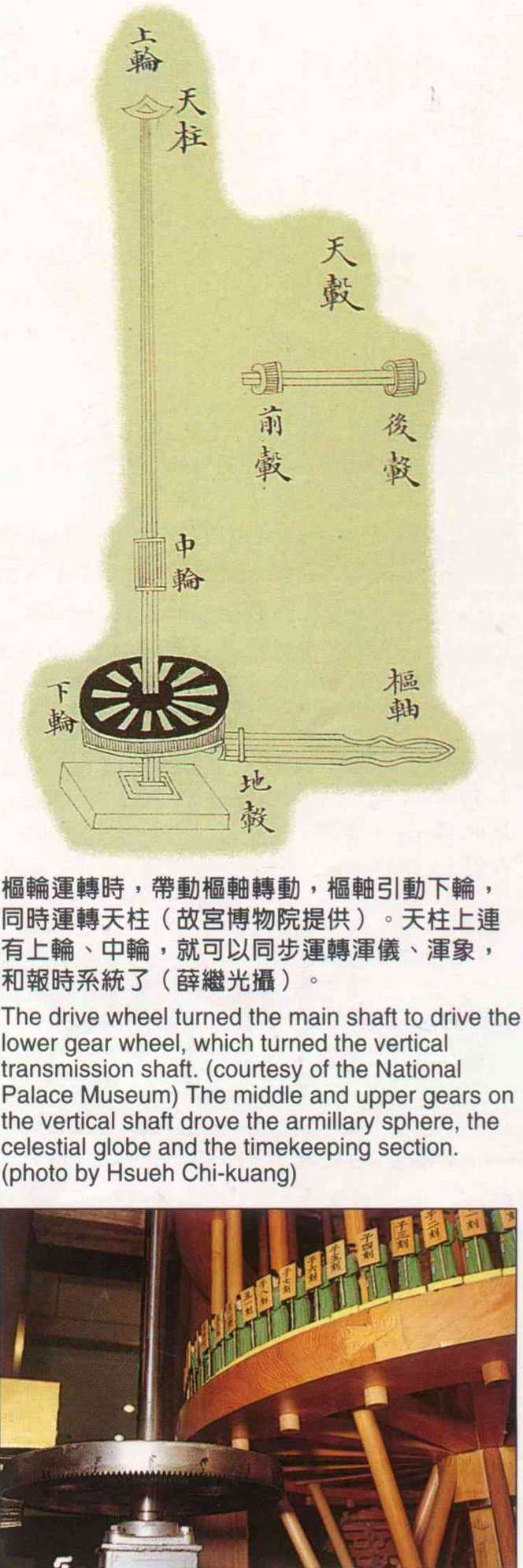 The drive wheel turned the main shaft to drive the lower gear wheel, which turned the vertical transmission shaft. (courtesy of the National Palace Museum) The middle and upper gears on the vertical shaft drove the armillary sphere, the celestial globe and the timekeeping section. (photo by Hsueh Chi-kuang)