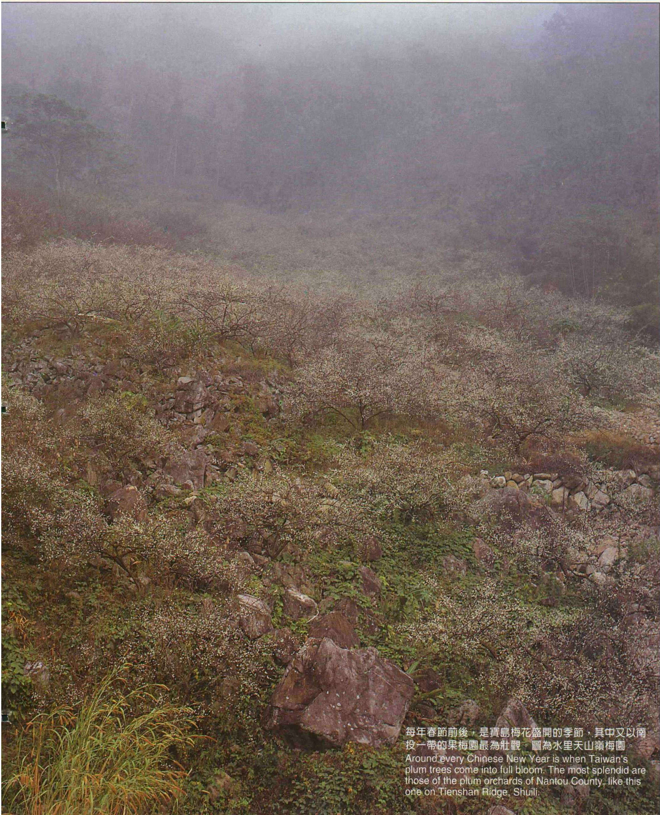 Around every Chinese New Year is when Taiwan's plum trees come into full bloom. The most splendid are those of the plum orchards of Nantou County, like this one on Tienshan Ridge, Shuili.