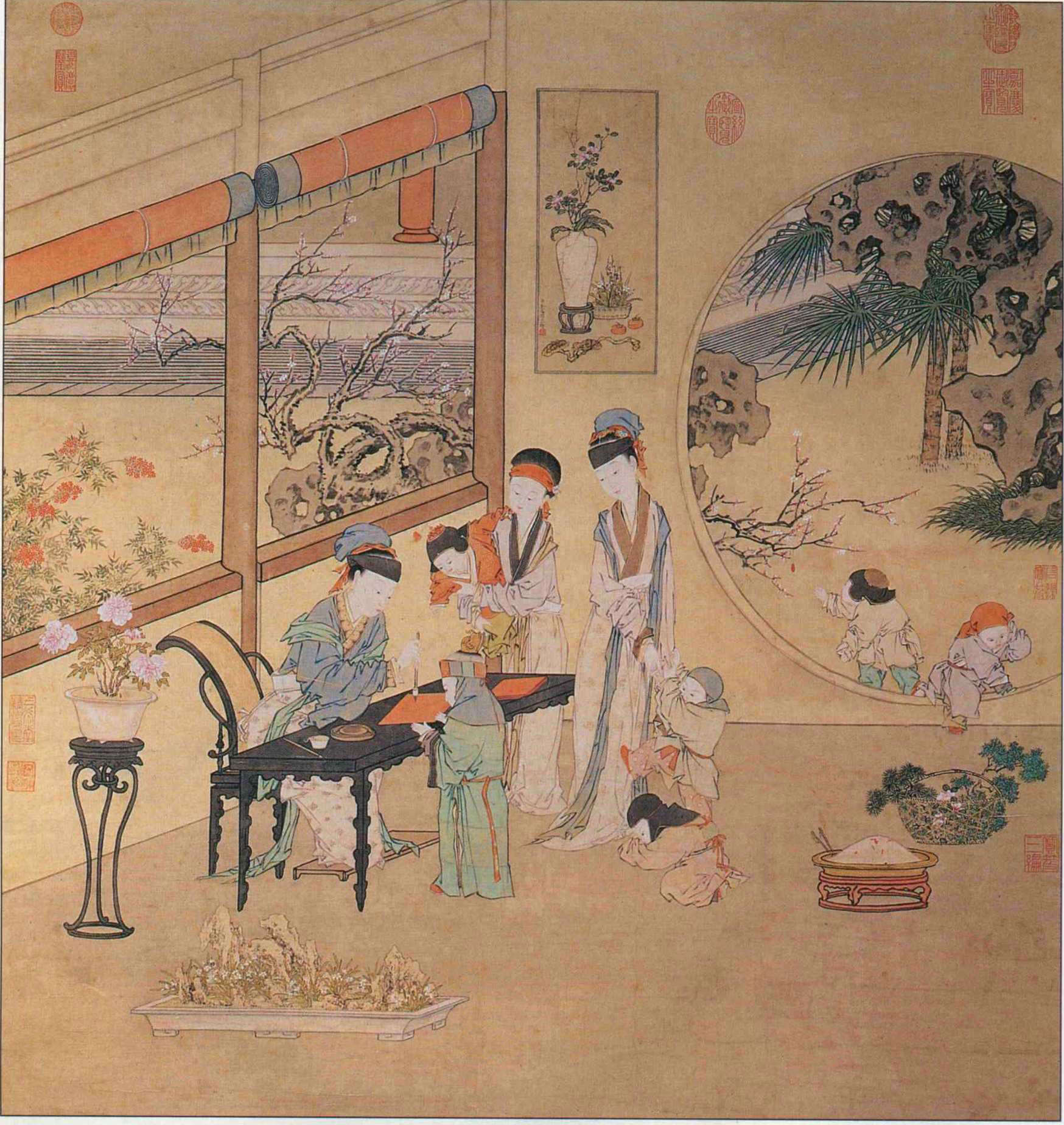 Music, chess, calligraphy, painting, wine--and flowers. Whether planted in the adjacent courtyard, grown indoors in tubs, or shown in a vase in a painting, they are something no traditional Chinese study can be without. Our picture shows Cao Dagu Teaching calligraphy, by Jin Tingbiao of the Qing dynasty. (courtesy of the National Palace Museum)