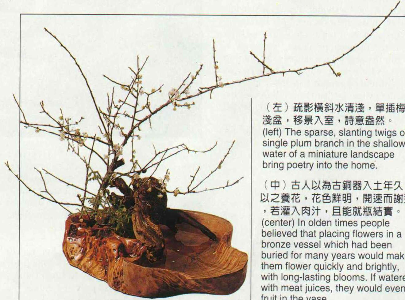 (left) The sparse, slanting twigs of a single plum branch in the shallow water of a miniature landscape bring poetry into the home.