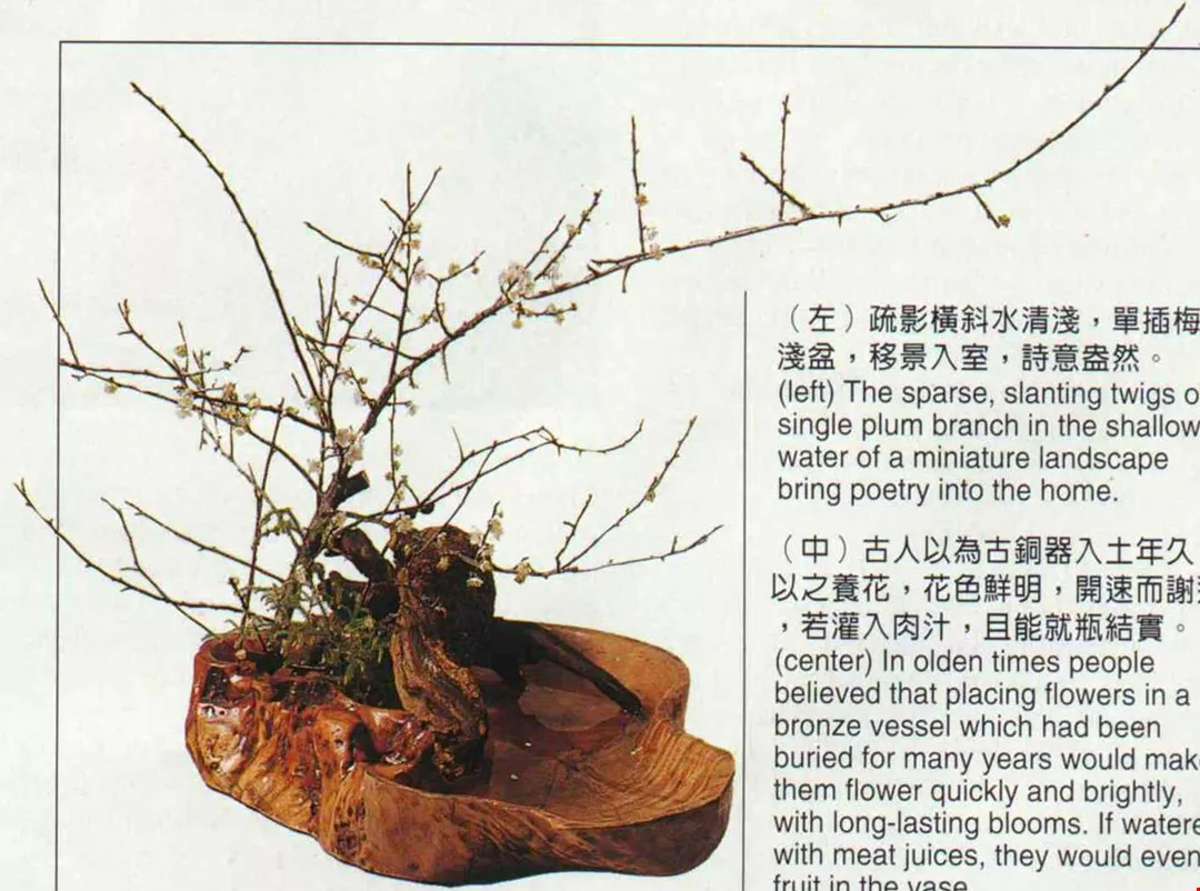 The Ming-dynasty book Festivals in Beijing states: "In the twelfth lunar month they tie plum plants in pots, then bury them three feet deep, [in cellars] five feet or more below ground, and light fires to slightly warm the earth. The plums gradually set white blossoms, which they encircle with paper. In the last days of the year they sell them on the markets as 'New Year flowers'. . . ." Huang Yung-chuan, an expert in the history of Chinese flower arranging, says that this technique of using cellars as hothouses emerged way back in the Song dynasty.