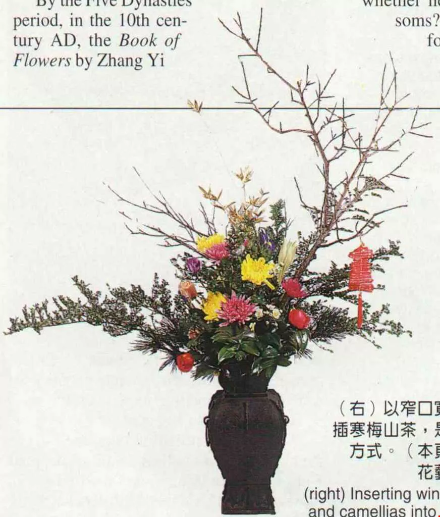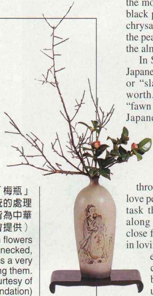 (right) Inserting winter plum flowers and camellias into a small-necked, wide-bodied "plum vase" is a very traditional way of displaying them. (photos on these two pages courtesy of the Chinese Floral Art Foundation)