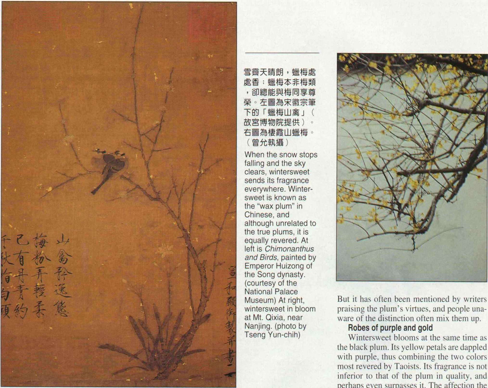 When the snow stops falling and the sky clears, wintersweet sends its fragrance everywhere. Winter-sweet is known as the "wax plum" in Chinese, and although unrelated to the true plums, it is equally revered. At left is Chimonanthus and Birds, painted by Emperor Huizong of the Song dynasty. (courtesy of the National Palace Museum) At right, wintersweet in bloom at Mt. Qixia, near Nanjing. (photo by Tseng Yun-chih)