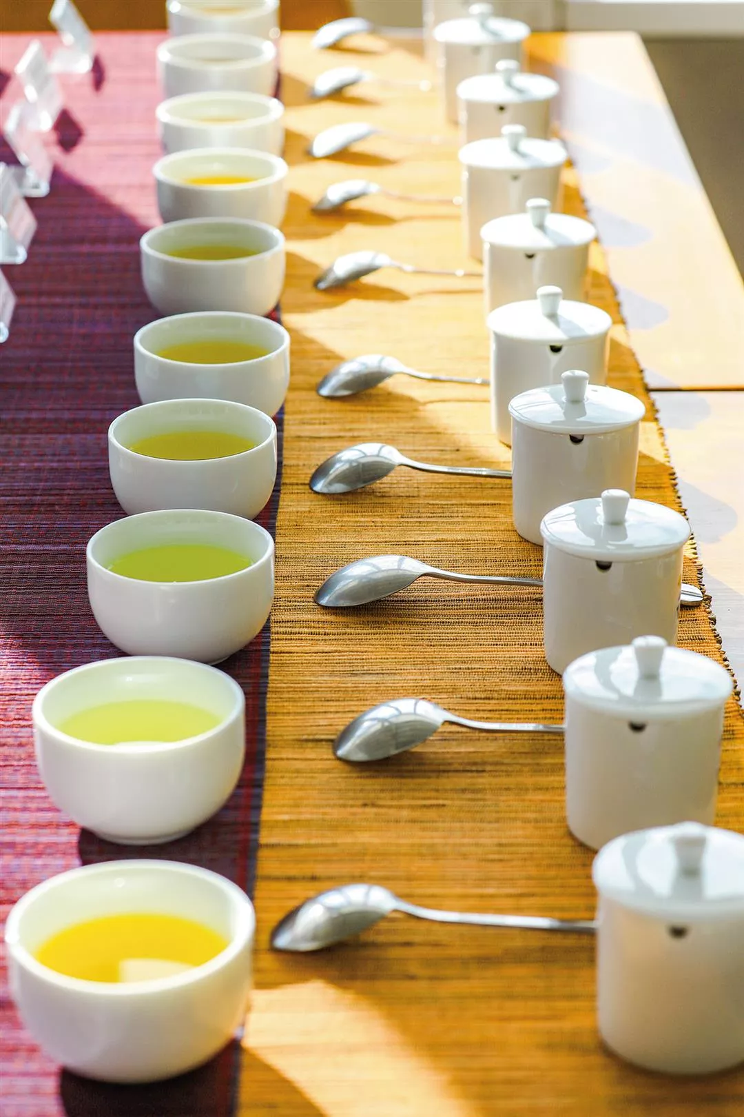One cup follows another. After smelling ten different cups of tea, we use a tea tasting spoon to scoop up some of the liquid and slurp it, holding it in our mouths for a moment before swallowing. Is it light and fresh, or rich and full-bodied? We make note of our olfactory and gustatory responses to each tea.