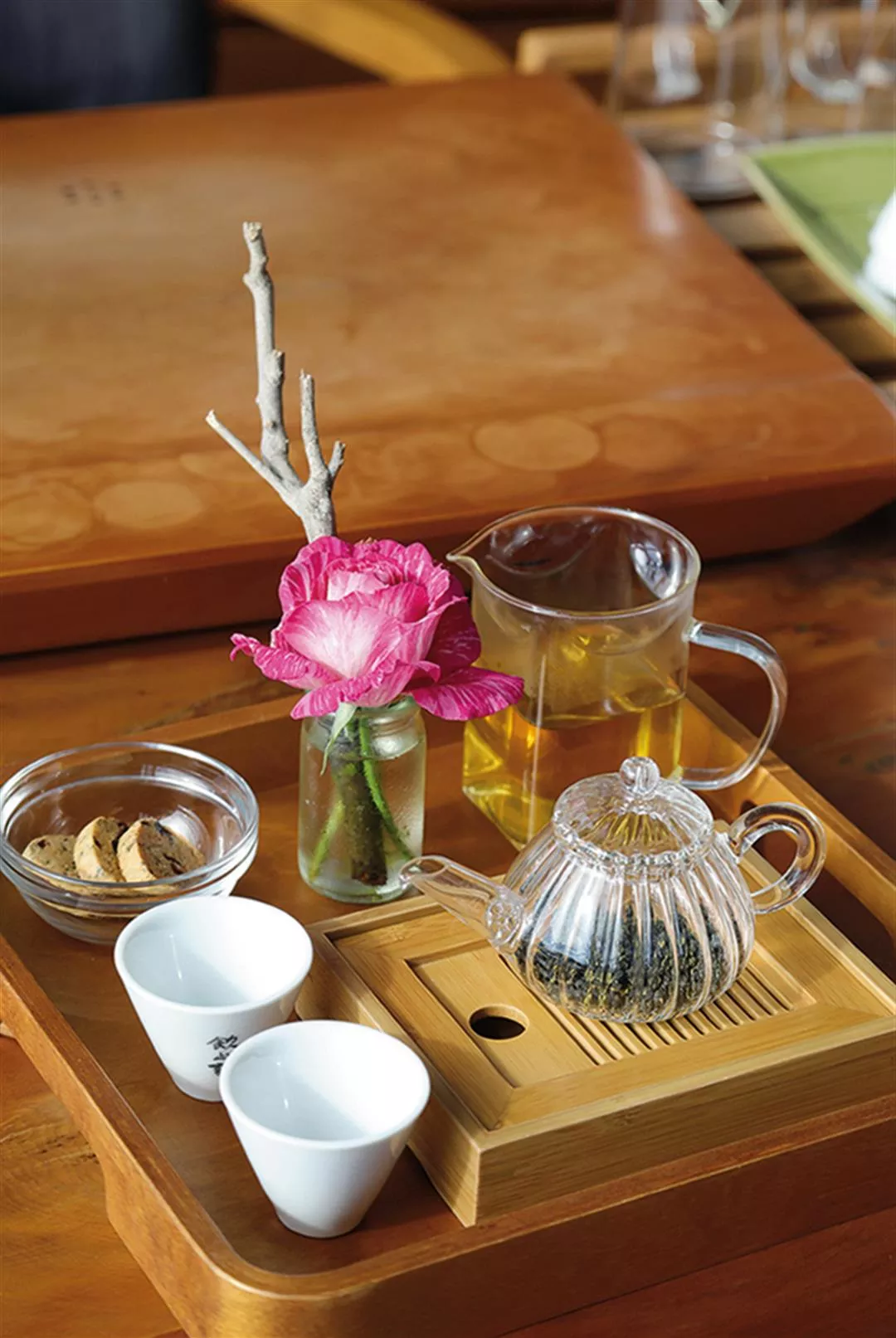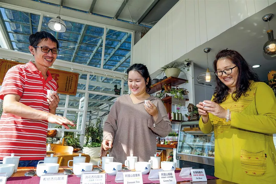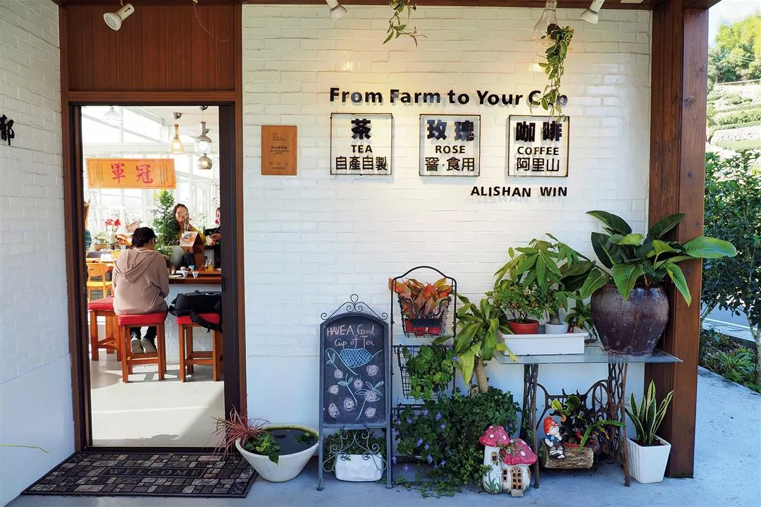 Alishan Win grows organic roses and makes floral oolong teas, attracting younger consumers with its combination of flower viewings and floral teas. Visitors can order teas by the cup to better appreciate the different layers of flavor that emerge with different brews, and the heady fragrance of the high-mountain teas. They can also share a pot of Alishan tea with their friends for just NT$150‡180 before strolling along a footpath and enjoying the views of Elephant Mountain.