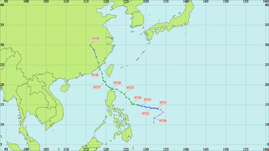 Due to their geographic proximity, Taiwan and the Philippines face very similar types of natural disasters. The map shows the path of 2023’s Typhoon Doksuri, which first moved westward over the northern Philippines and then turned north toward Taiwan. (courtesy of CWA)