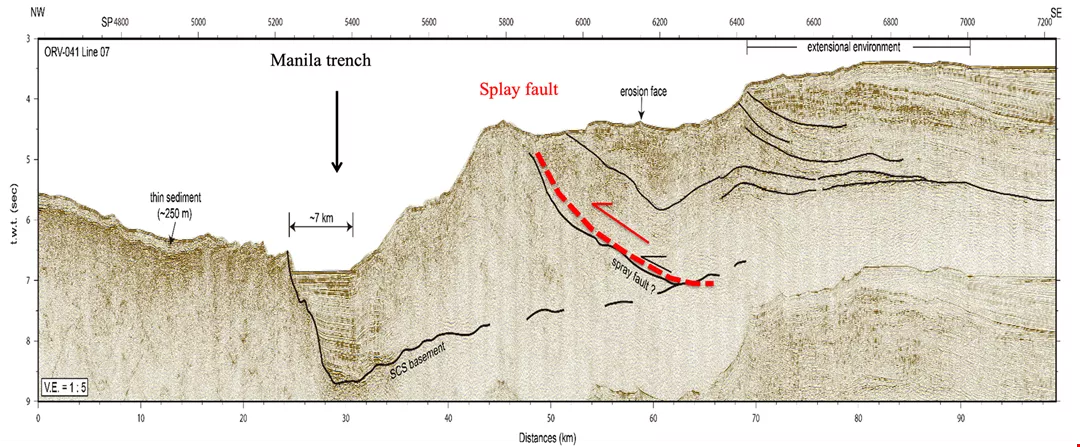 Seismic airguns are used to produce acoustic waves that travel to the seafloor and are reflected back, allowing researchers to learn the structure of the seabed. The image shows the results of geological studies of the Manila Trench. (courtesy of Hsu Shu-kun)