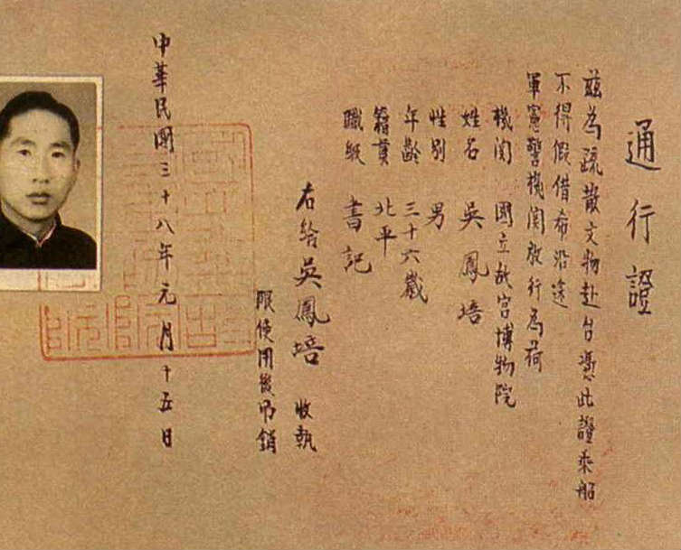 When Wu Feng-p'ei escorted the collection to Taiwan in 1949, he was 36. This was his travel permit.
