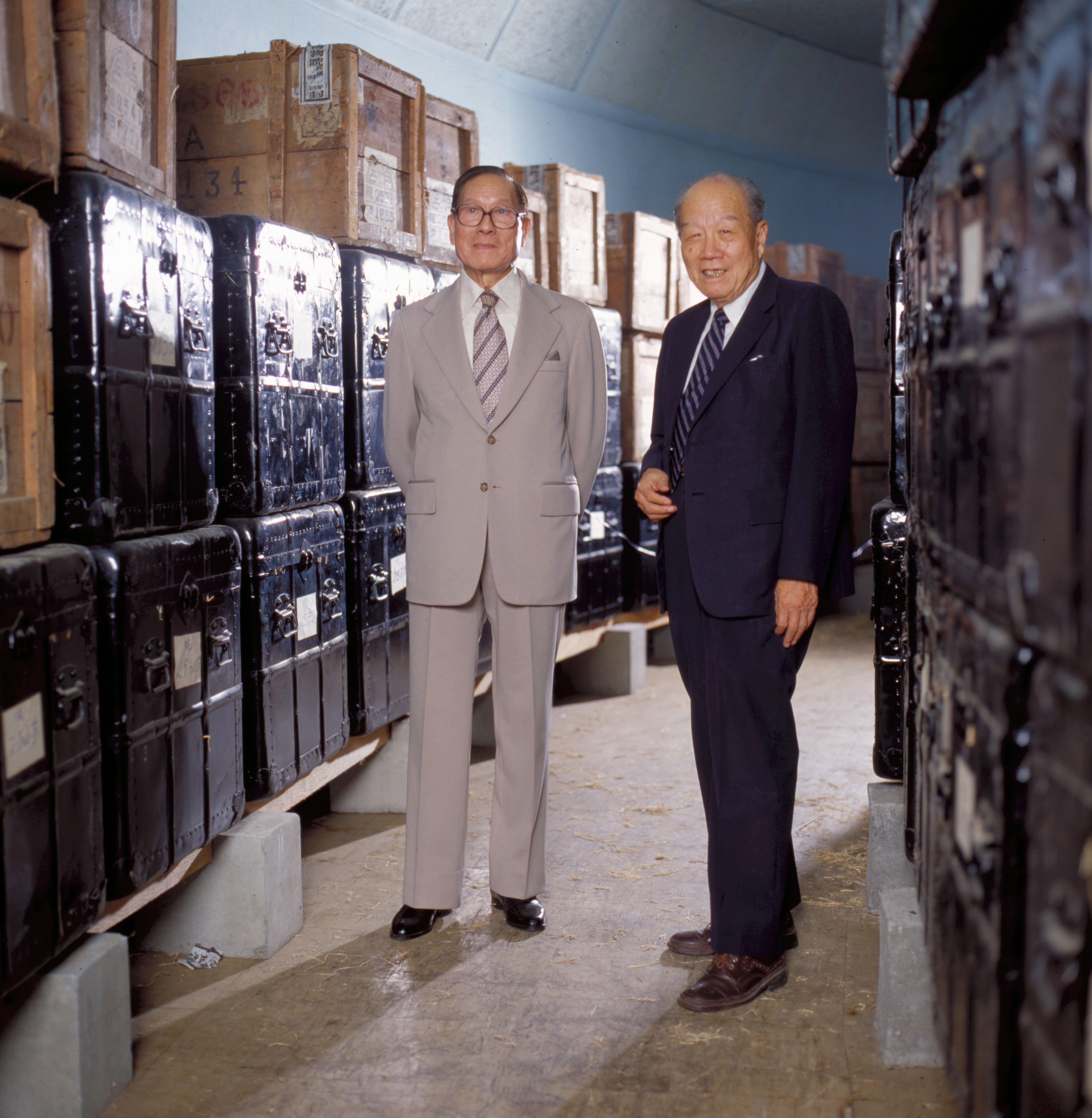 Han Lih-wu (l.) and Na Chih-liang (r,) pose in a warehouse in front of some of the treasures they went through so much to save.