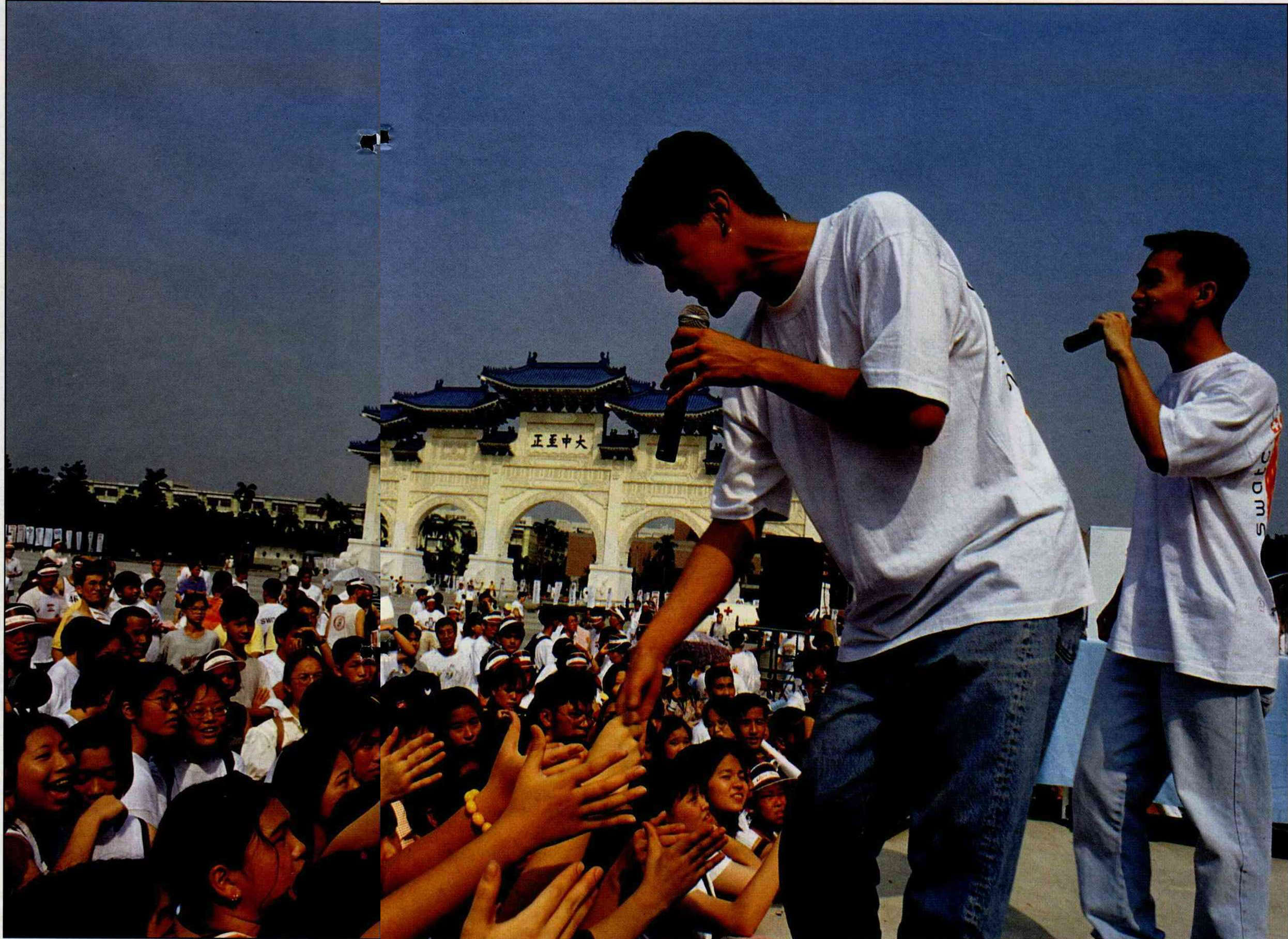 Shortly past five in the morning, the loudspeakers that have already been set up in front of the Chiang Kai-shek Memorial Hall in downtown Taipei begin to blast out a powerful bass line with a fast beat. By the time one's ears have finally gotten used to the high-decibel volume, the opening strains of the song are over. What follows are vocals sung in a mix of Chinese and English. The voice, rapping in Mandarin with an accent that is ever so slightly off, alternately becomes submerged in and floats to the top of the heavy accompaniment.