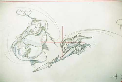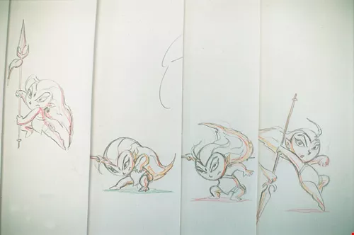 Original hand-drawn sketches from Fire Ball. After these sketches are completed, the animators use them as the foundation for creating the frames of the animation, making the characters come to life on the screen.
