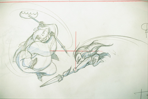 Wang Tung believes the studio set the bar high for his first foray into directing animation. The animators were masterful, "but the thing was comparatively lacking creativity and drama. The storytelling potential was a bit weak." And so he would often be down on the floor himself, acting out the various postures, poses, and fighting moves of Fire Ball and Monkey King, helping the keyframe artists, with their top-grade work and rich experience, see exactly what kind of spirit he was looking for.