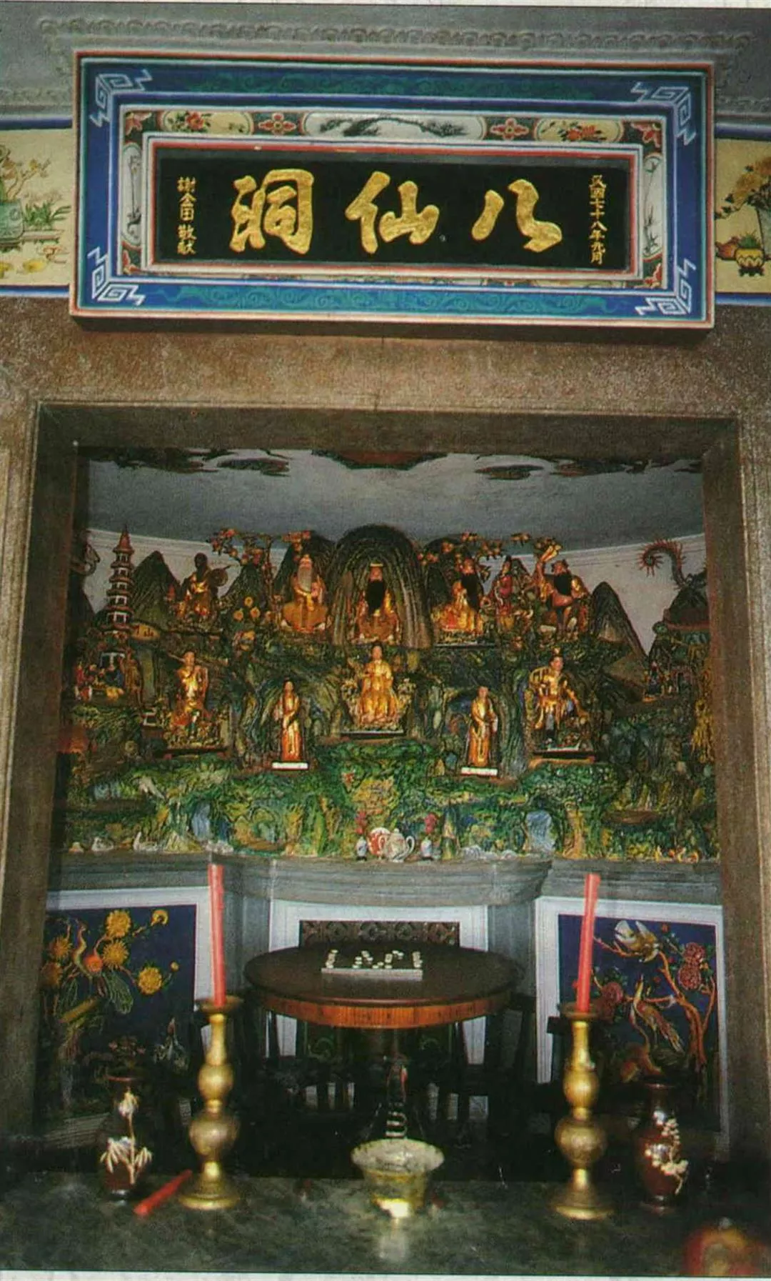 Lu's fame as a god is firstly due to his being one of the "Eight Immortals"--gods of happiness popularized in traditional folklore as paying obeisance to the Queen Mother of the West. Symbols of good fortune and longevity, they are widely loved among the people. Most traditional homes will have a portrait of the Eight Immortals in their living room along with an altar, and on festive occasions an embroidered version of the Eight Immortals will be hung from the lintel. Their mischievous likeness can also often be seen on the pillars and roofs of temples.