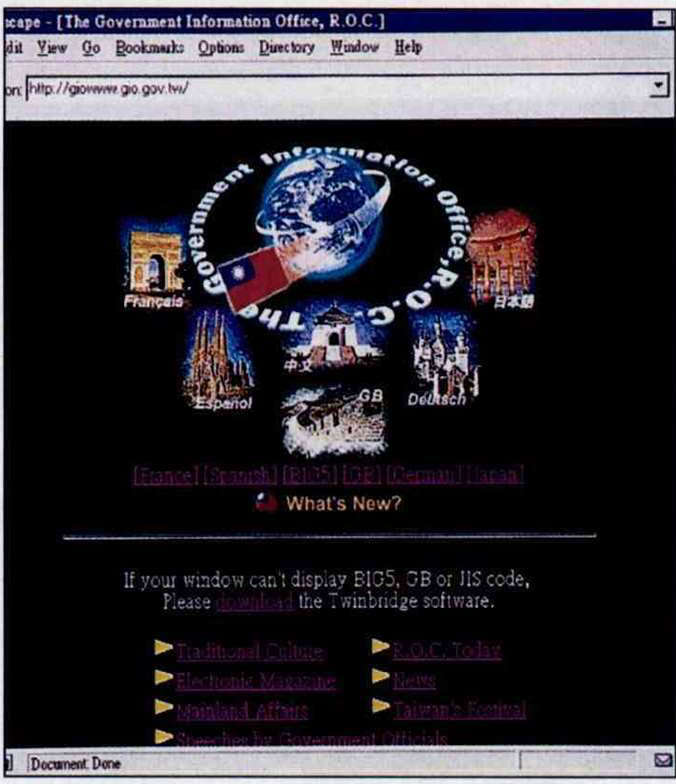 Amid the hundreds of Internet websites in the ROC, the Government Information Office's site (http://www.gio.gov.tw) stands out as a pioneer by offering information in simplified Chinese characters and in German, French, Spanish and Japanese. These services went on line in July of this year. They are not only good news for friends in non-English-speaking countries and in mainland China, they also offer a useful source of Chinese information to Internet users overseas whose computers cannot display characters in Big 5 code.
