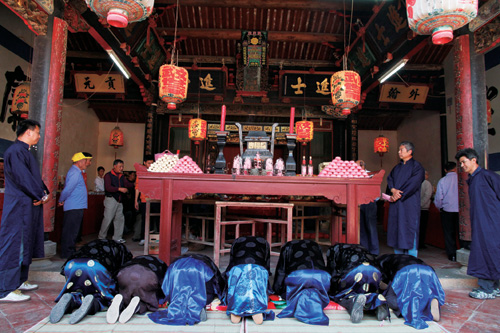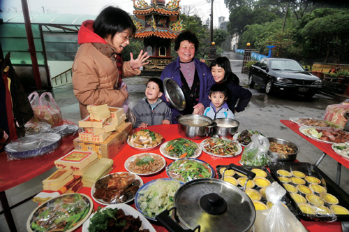Numerous traditional values and rituals are embedded in the Chinese New Year. One of the most unsatisfactory things to many women is that while they do all the housework, cooking, and preparations, men take the lead roles at key moments like paying respects to ancestors and formally opening the family feast. The photo shows a ceremony being held at the Tsai clan shrine in Kinmen.