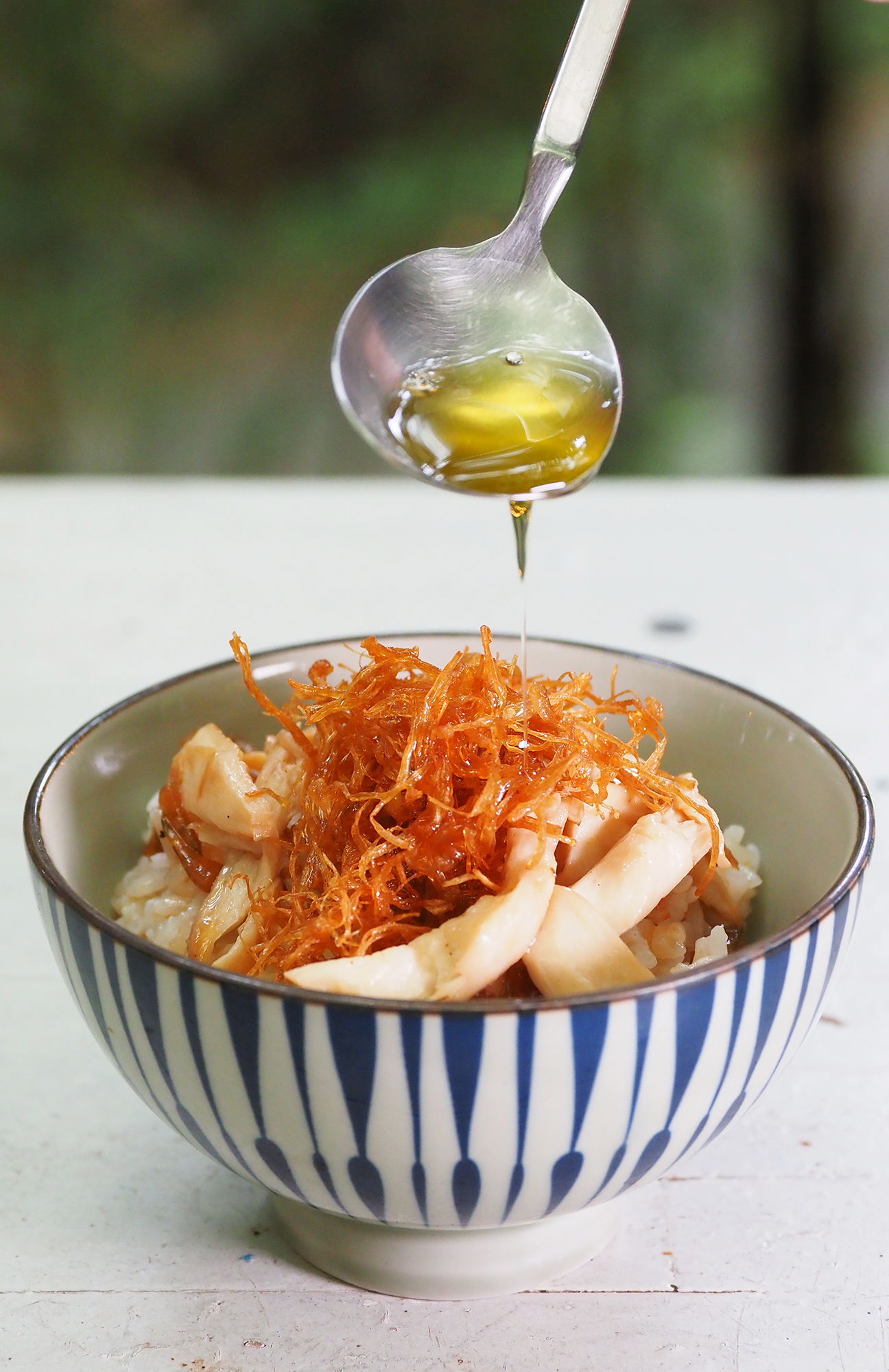 Enoki mushrooms deep-fried in camellia oil look just like shredded scallops. Drizzling on some of the oil that was used to fry the mushrooms makes the dish all the more fragrant.