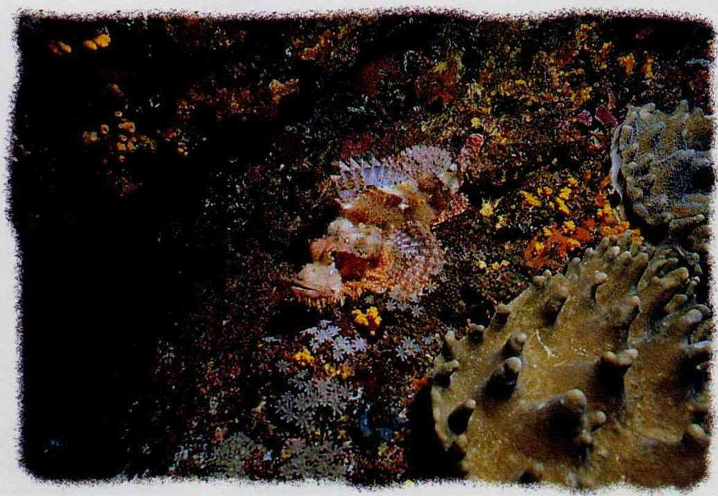 Hard to distinguish from actual rock, stonefish, with their poison glands in their hard fins, hide in the coral rock, heads half-exposed, waiting to pounce upon any small fish that might wander by.