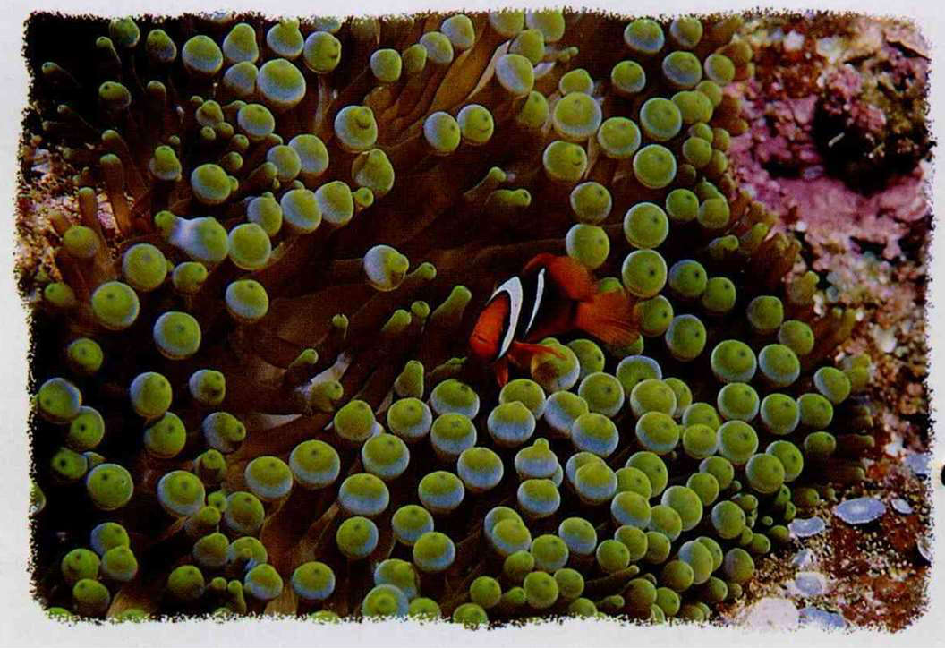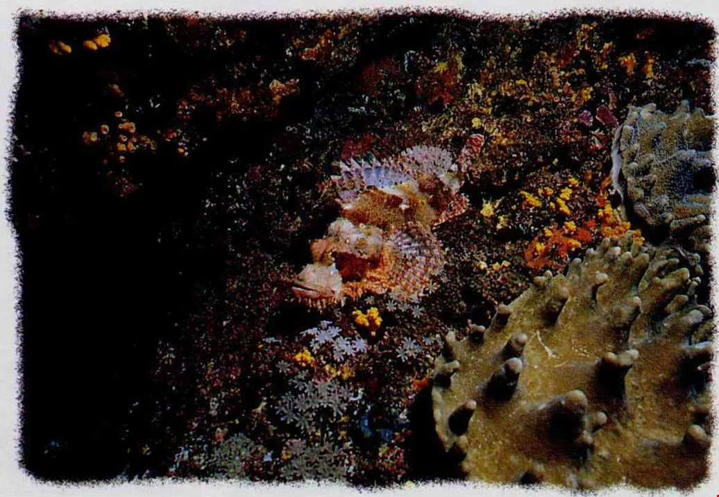 On the side of a giant coral formation that is 100 or even 1000-plus years old, grow water lilies, which are a kind of echinoderm that looks like a flower blooming in the sea. With backs striped yellow and blue, a school of fusilierfish swim by. A clownfish, a strange being that lives on sea anemones, is busy delving into everything. Colorful butterflyfish and damselfish hiding in the web of coral reveal half their heads. Hawkfish rest on top of the coral waiting to pounce upon any small fish that might float by. On the sea floor 20 meters or more down, garden eels that resemble long whips are catching plankton. When they see the divers move close, they pull back into the sands. The goatfish use two long whiskers under their cheeks to feel for food hiding in the sand. At the side of a cliff, a group of bright red sea fans shake with the current, and a school of light green, light purple, and light red anthids float by. Menacing lionfish, covered with what seem to be thorns and claws, swim along face down. Upon seeing human divers--what strange creatures!--sea snakes swim by and touch their flippers....