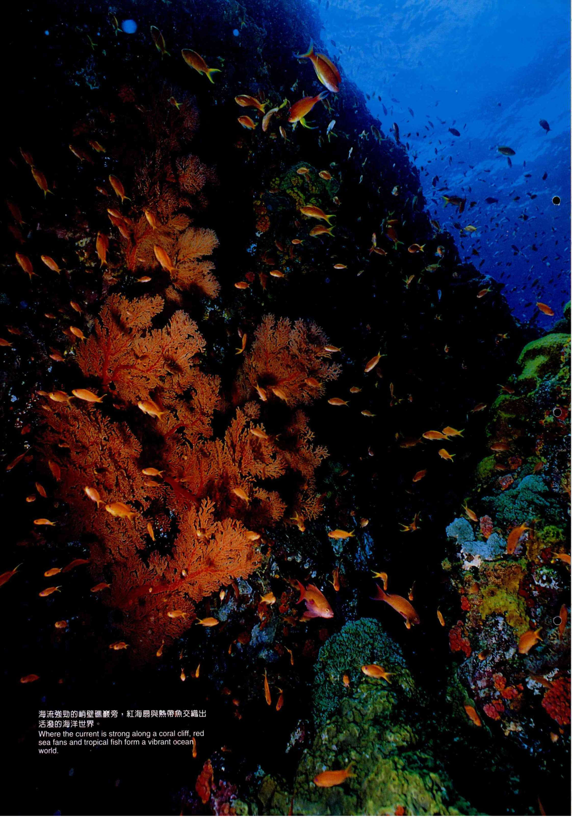 Where the current is strong along a coral cliff, red sea fans and tropical fish form a vibrant ocean world.