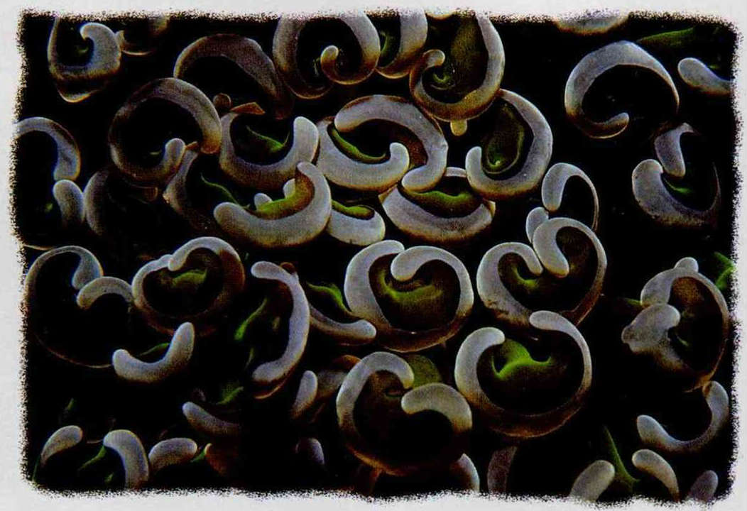 Ahead, the sea bed is terraced downward. The scenery all around them comes to life in the soft sunlight, revealing a busy and vibrant world at the bottom of the sea. Amid the surge channels and the sea bed that gently rises and falls, are soft coral groups, as colorful as fruit trees in flower, swaying like willows in the wind. They extend tentacles, shaking in the current, to catch food. Huge, erect staghorn corals branch like trees. Schools of tiny tropical fish, looking for food, shuttle back and forth amid the coral. Around and about are all varieties of colorful shells, conches, sea lilies, sea anemones, sea urchins. . . as well as scattered algae and Christmas tree worms attached to the stony coral. The entire effect is like a vast and festive garden on the ocean floor.