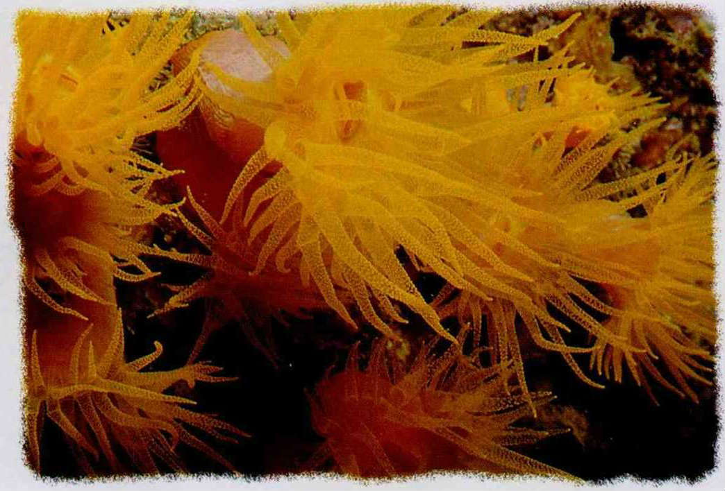 Orange-red tube coral usually grows at depths of ten meters or more in the caves of coral reefs. Here tube corals have opened their tentacles to catch plankton.