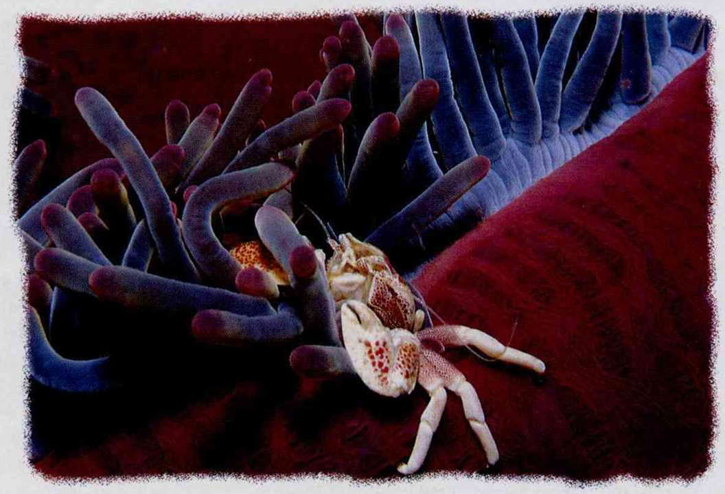 A tiny anemone crab enjoying a stroll on a sea anemone. The sea anemone's tentacles form a natural cover, on which are stinging cells that paralyze intruders. The sea anemone makes them its home.