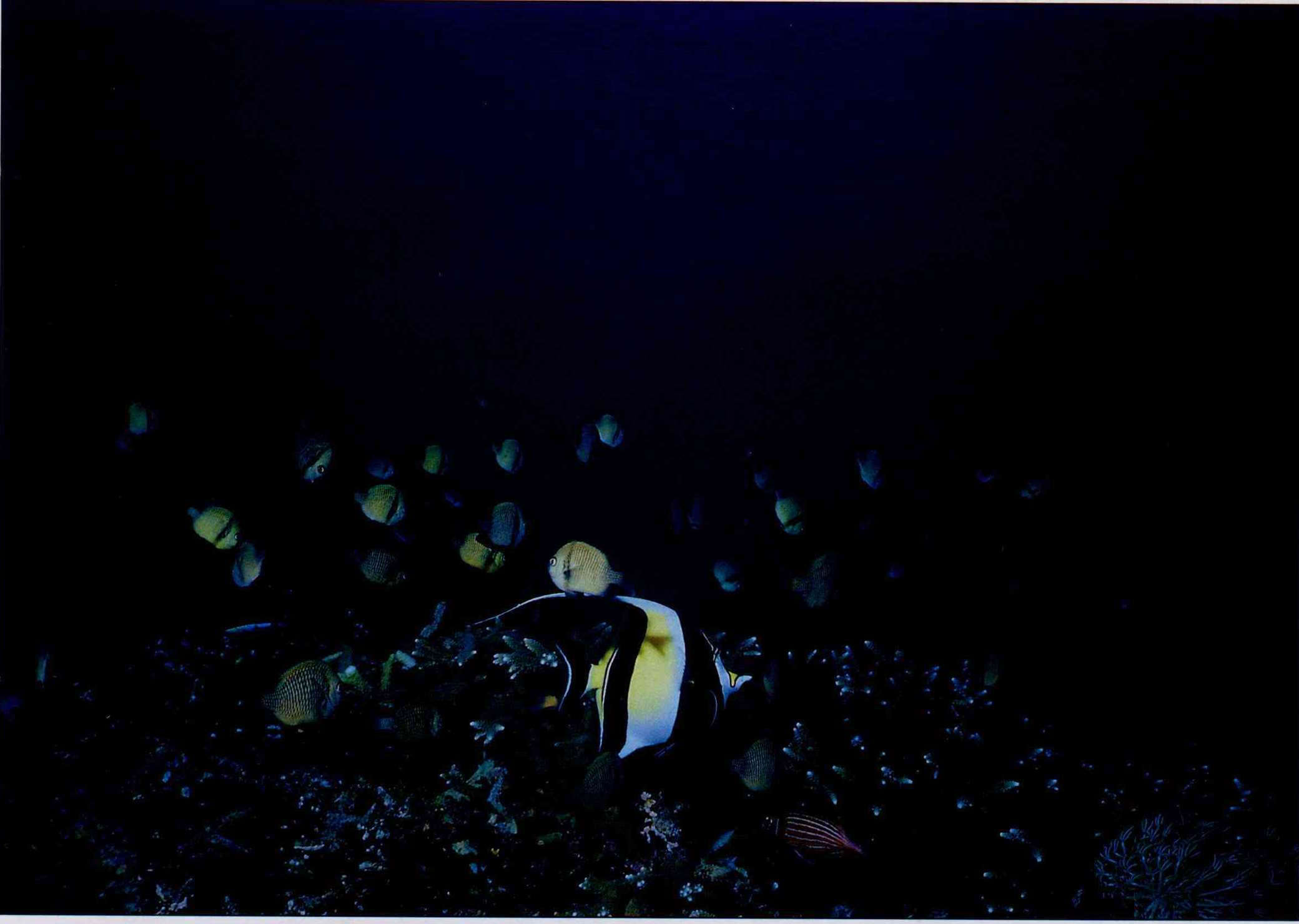 The divers have kept close to one another. They make an OK sign and bring out bread, which they wave at the fish. Soon tropical fish approach en masse, encircling them and silently feeding. Off to the side, a diving instructor sets up an underwater camera to make a record of this harmonious feast.
