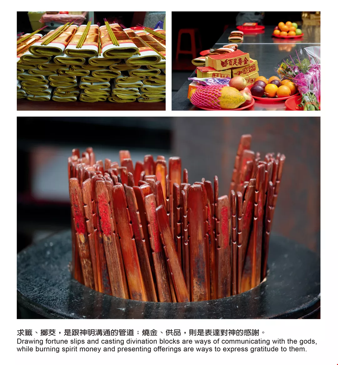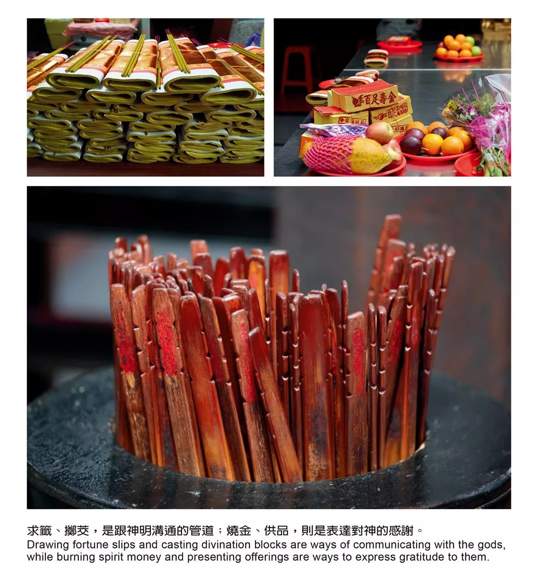 The incense, offerings, and spirit money used in worship are all channels of communication with deities and spirits. Lai Longyi says that foreign visitors often ask what those long stick-shaped objects are. “In olden times people used incense as a kind of ‘courier’ to carry their hopes to the deities.” The image of incense smoke wafting upwards gives the impression of the smoke carrying people’s aspirations up to heaven. Some people even explain the meaning of incense burning by comparing it to Wi-Fi, which gives foreign friends an immediate understanding of its purpose.