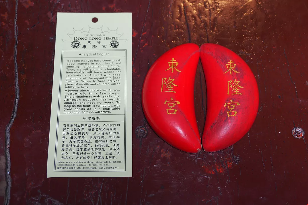 If you want a clear answer from the gods to a question expressed in your prayers, then casting jiaobei (divination blocks) is another way to communicate with them. These are a pair of crescent-shaped red blocks that are flat on one side and rounded on the other. When you toss the two blocks on the ground and one comes up yang (lying with its rounded side facing up) and other yin (flat side up), this is called shengjiao (“sacred blocks”) and it means that the gods have agreed to your request, and the matter that you prayed about will go smoothly; ordinarily this “yes” only holds if one throws a shengjiao three times in succession. Another method of seeking answers from the gods is by drawing bamboo “fortune sticks” or printed “fortune verses” that are provided by the place of worship. In recent years a number of temples, aiming to help foreign visitors better understand Taiwan’s folk belief systems (including Hsing Tian Kong in Taipei, Donglong Temple in Donggang, Pingtung County, the Mazu Temple in Lugang, Changhua County, and the Grand Mazu Temple in Tainan) have prepared English-language fortune verses to point them in the right direction.