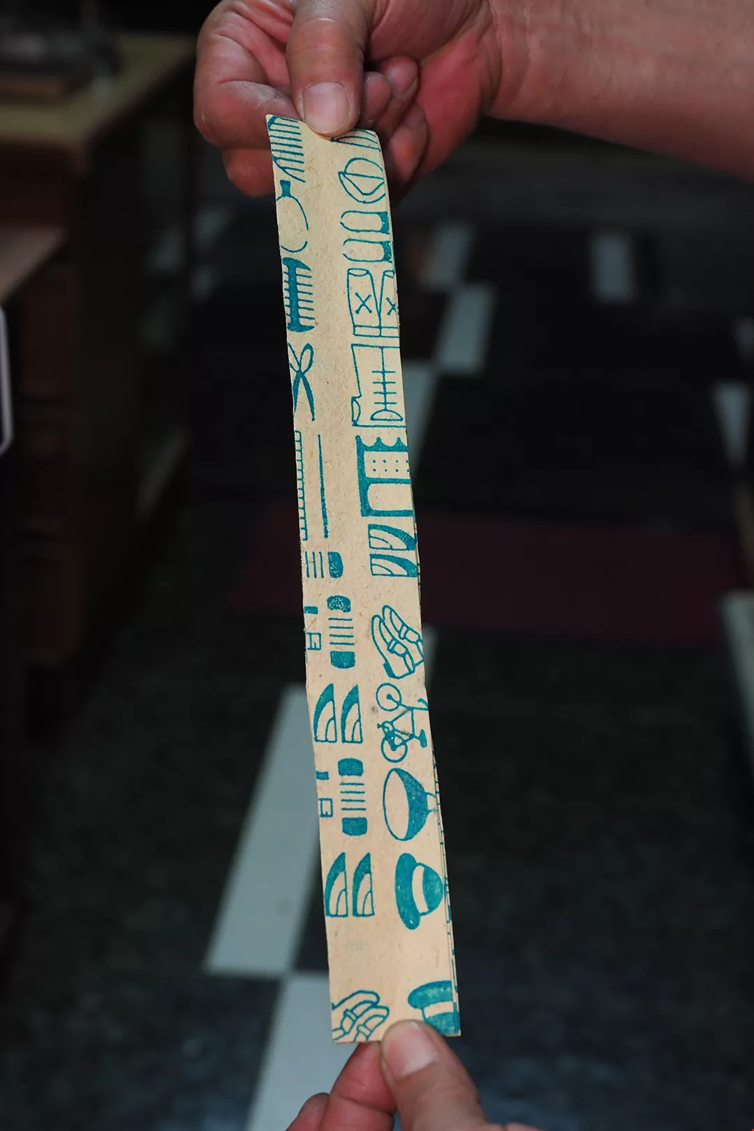 “Spirit money, meanwhile, is based on the concept of a humble offering that expresses gratitude to the gods,” says Lee. Lai explains that jinzhi (“gold paper”) variety of spirit money is reserved exclusively for worshipping deities, while the money burned for hungry ghosts is yinzhi (“silver paper”). Jinzhi, the currency of the gods, is made by sticking gold-colored metal foil onto bamboo paper, and is often also printed with auspicious Chinese characters expressing the desire for wellbeing or longevity. The spirit money that is burned for hungry ghosts includes a type called jingyi (“threads and clothes”) that represents products needed as daily necessities by the spirits. Lai unfolds a sheet of jingyi spirit money on which are printed images of combs, clothing, shoes, hats, and other everyday items, and explains that the die-cut hole in the paper is there in simulation of ancient coinage, which had a hole in the middle.