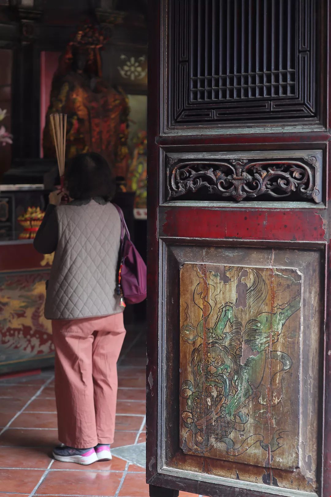 When we visit the Taipei Xia-Hai City God Temple in Dadaocheng, informational materials director and foreign language guide Titan Wu leads us into the temple via the “dragon” side (the left-hand doorway). “Generally speaking, people enter via the dragon side and exit via the tiger side. The middle doorway is for the deities to pass through.” In fact, the decor of the temple hints at this: “Looking at the images on the wall, the head of the dragon faces inward, while the tiger faces outward.”