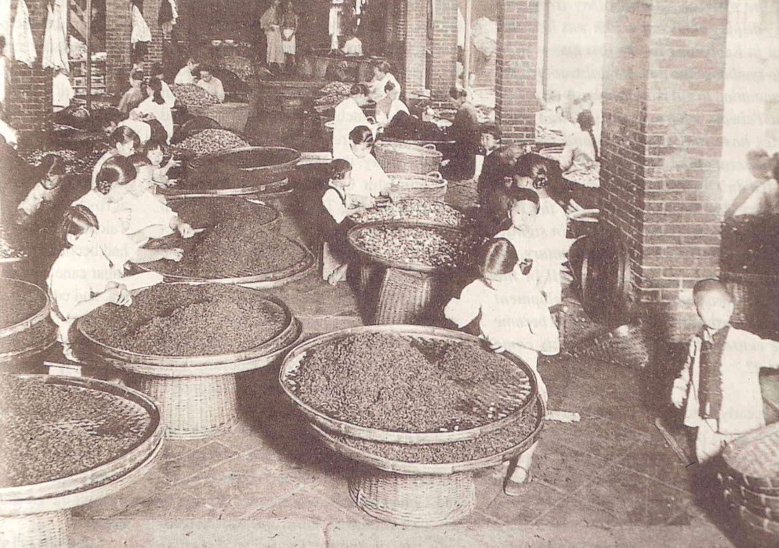 A British tea merchant introduced Oolong tea to Taiwan in the latter part of the 19th century. Soon it was in cultivation throughout northern Taiwan, and Taipei rose as a major center of the tea trade. Kuiteh Street was lined with Chinese and foreign tea trading houses dealing in Oolong and Pouchong tea. The women work for major Taipei tea merchants, and are picking out the best tea leaves just after a harvest.