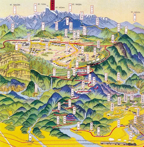 During Japan's rule over Taiwan, the breathtaking peaks of Niitakayama (the Japanese name for Yushan) and Alishan were grouped together as "Niitaka-Arisan" and designated as a national park by the governor-general. Introducing Niitaka-Arisan by Chinese-Japanese artist Tsunemitsu Kaneko, presented a bird's-eye view of the Alishan railroad, giving a clear picture of the environment of Alishan at the time as well as the route of the forest railway.
