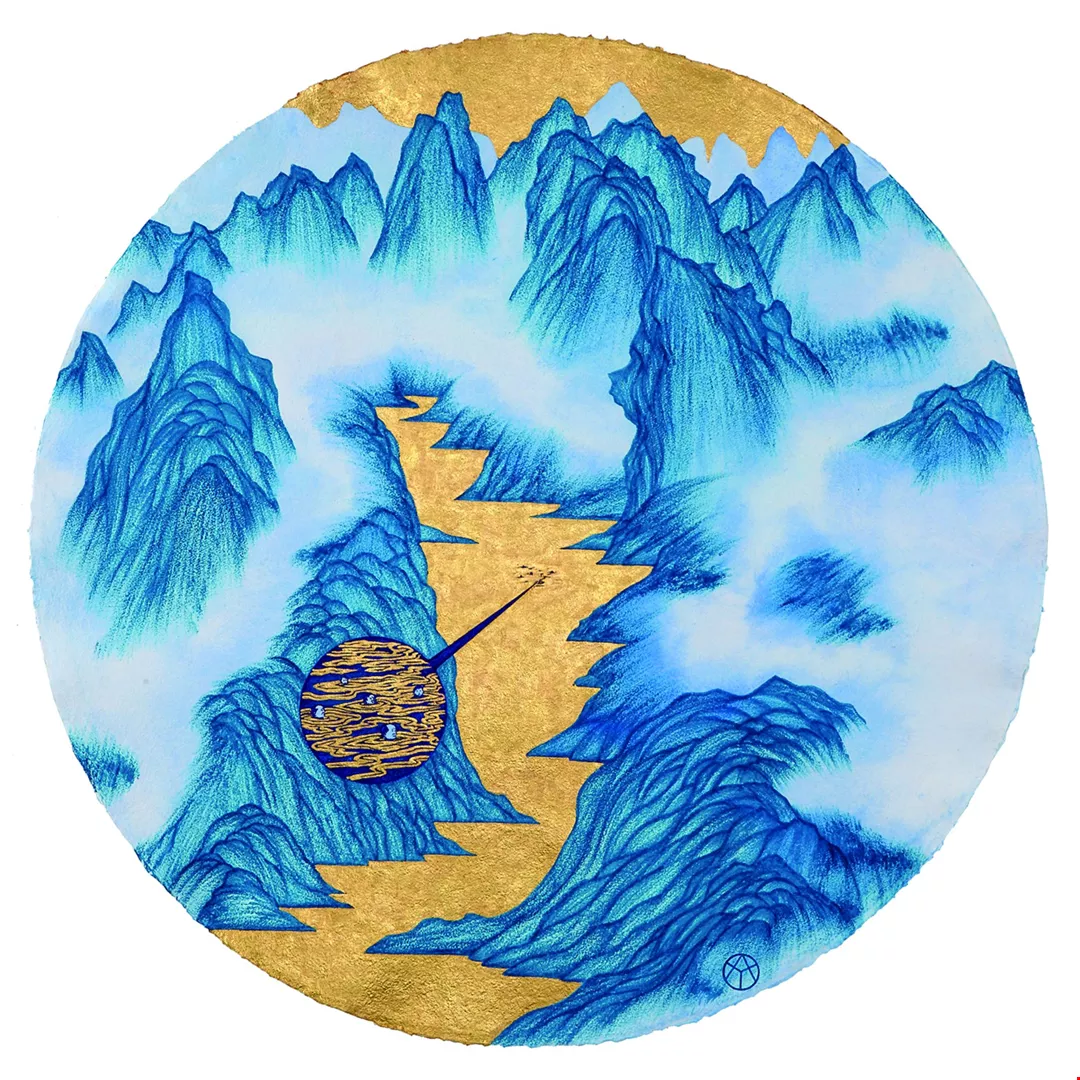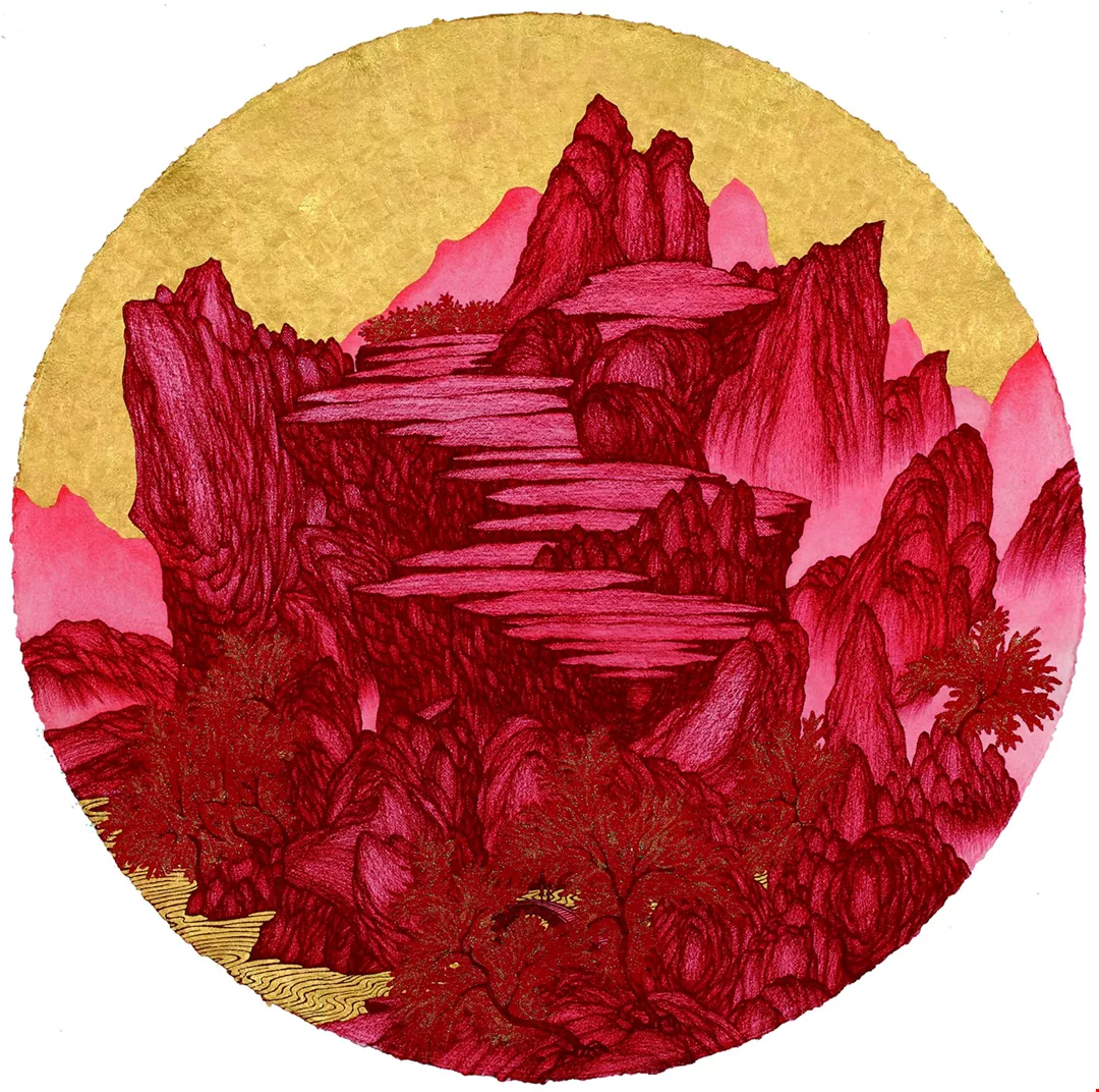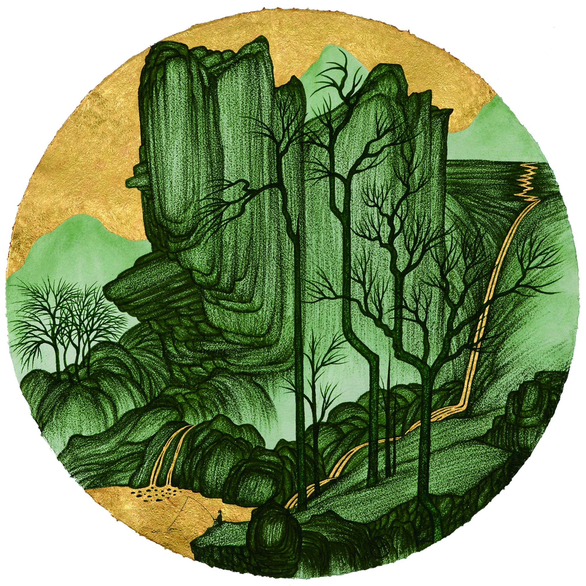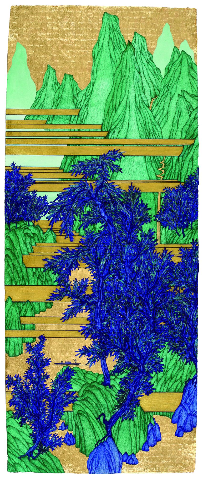 Since 2007, Yao has focused on creating his own format of landscape painting by reforming the traditional Chinese ink painting methodology. Instead of using brushes and rice paper, the standard implements for an ink painter, Yao uses oil or water-based marker pens to reproduce classical landscape painting masterpieces on handmade paper imported from India. He then fills in the background with gold leaf. The artist will sometimes insert a dialogue box or an image of a computer screen window, further blurring the lines between classical ink paintings and the paradigms of the modern world. He describes his style as “gold and green landscapes,” suggesting a brightly colored format of Chinese landscape painting distinct from the literati tradition that featured minimal use of color.