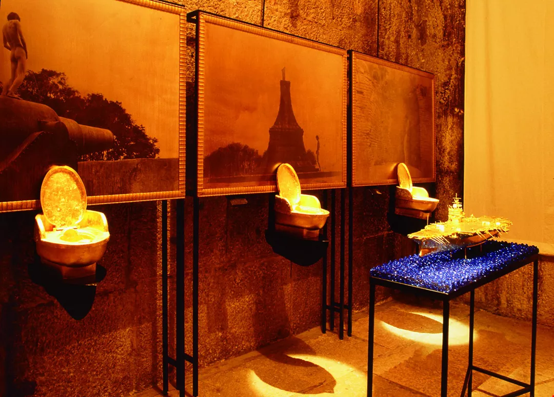 In the 1990s, after Yao graduated from college and completed his compulsory military service, he focused on performance and installation arts, which were gaining in popularity at the time. In 1997, he was selected to co-represent Taiwan at the Venice Biennale art exhibition with his 1994 installation work Military Takeover, which casts a sarcastic look at recurring power shifts in Taiwan’s history. In the work, Yao presents himself in sepia-toned photographs, standing naked while urinating at six locations along the Taiwanese coast. He chose sites in Keelung, New Taipei City and Tainan where incoming powers had arrived since the 1620s from the Netherlands, Spain, mainland China and Japan to occupy the island. Paired with each photograph was a gold-leaf-covered toilet.