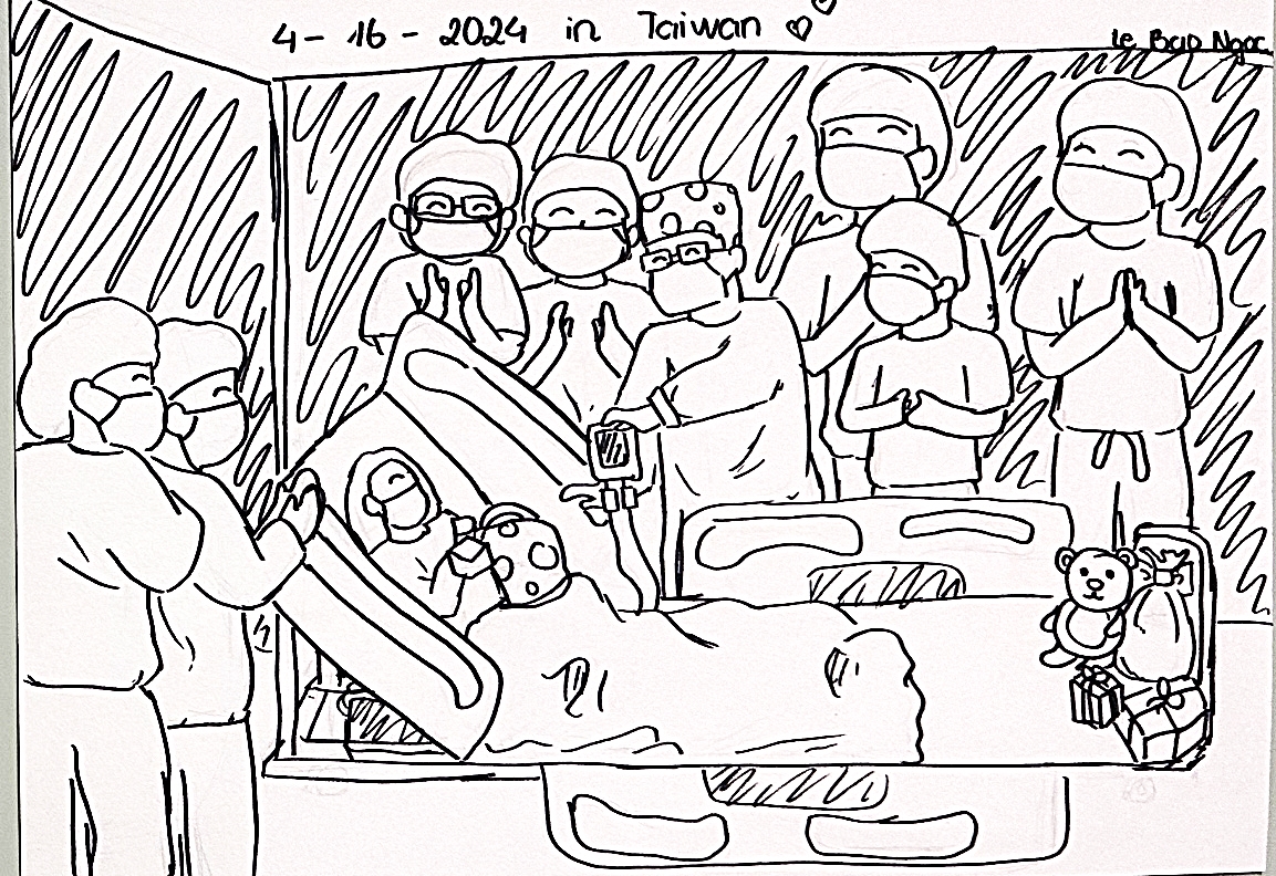 A Vietnamese girl named Bao expressed her gratitude for her treatment in Taiwan through drawings. This image shows her medical team expressing best wishes at her bedside.(courtesy of Hualien Tzu Chi Hospital)