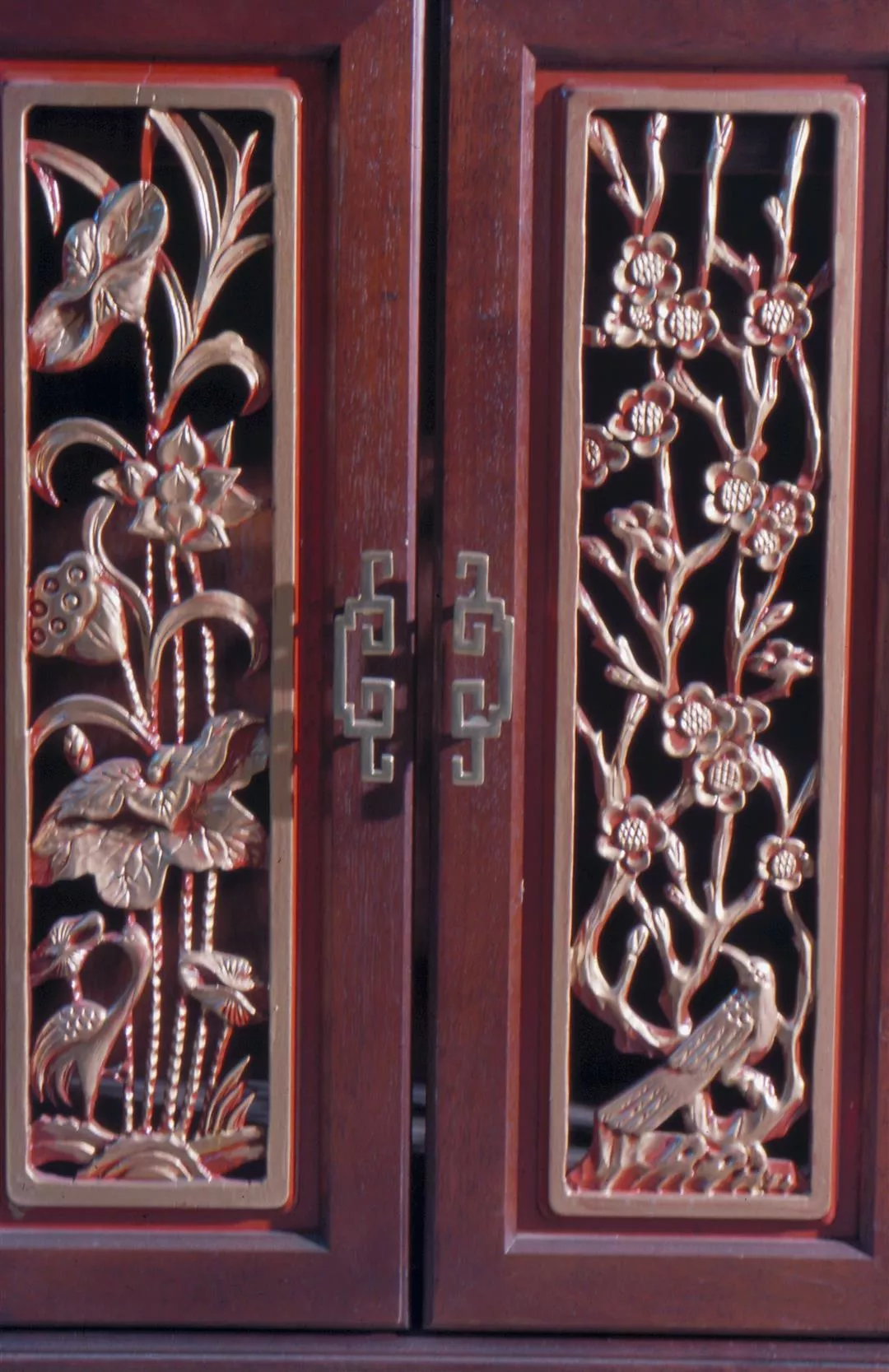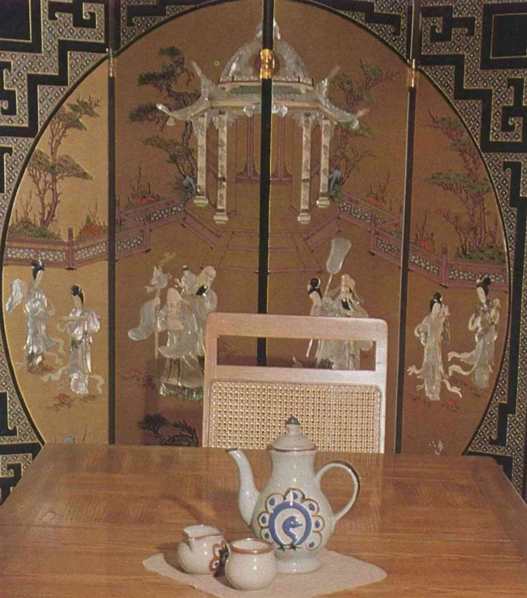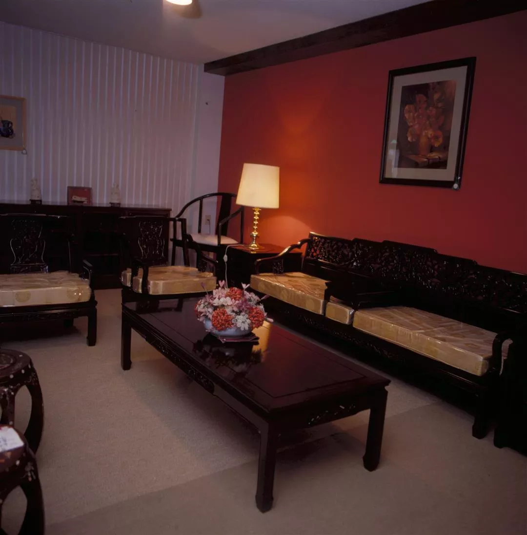 1. Redwood carved furniture (supplied by Ricardo Lynn Co.). 2. Antique Chinese-style screens.