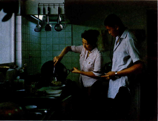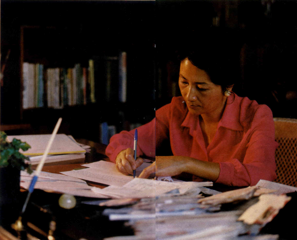 Asked how she manages to do the housework while coping with her various jobs, Madame Wei-wei explained that she finds housework to be a form of mental relaxation when she cannot think clearly. In addition to her two "silent servants" in the kitchen, the refrigerator and the washing machine, Madame Wei-wei is helped by her two sons and one daughter, all of whom are still in school.