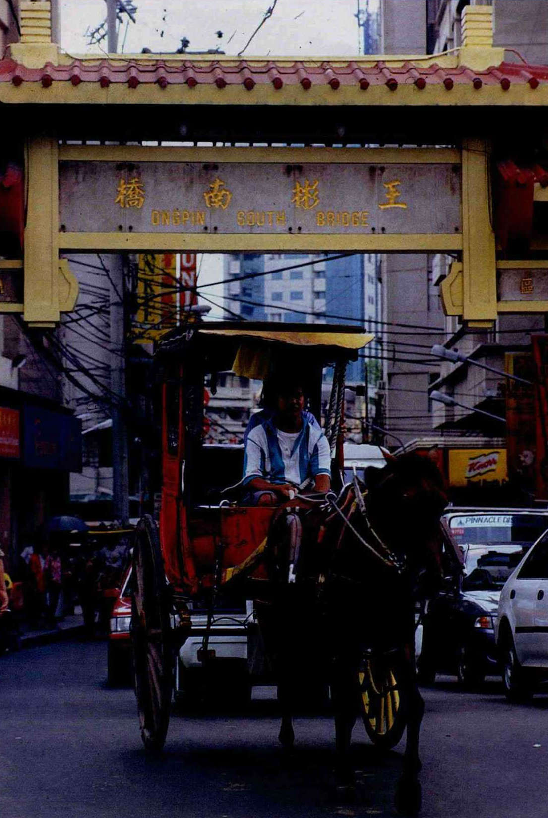 The area around Ongpin Street is Manila's Chinatown, where the roads are lined with Chinese-style bakeries, art shops, jewellers and restaurants. Fruit vendors and little girls peddling garlands of jasmine stand or sit at the roadside, while pedicabs and horse-drawn carriages carrying locals and tourists weave cleverly through the narrow lanes. There's an exotic aroma in the air, a combination of tropical fruit, flower scent and horse manure, and a jumble of different languages-English, Minnan, Filipino dialects-assails your ears. All of a sudden you are drawn to a halt by the sound, which wafts down from an upper story, of a pipa being plucked, along with resonant, melancholy singing. For a moment it is as if you have stepped back several centuries in time. . . .
