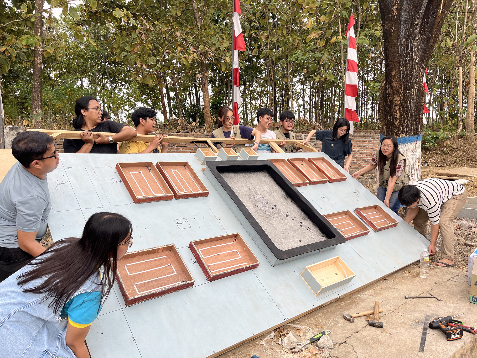 The diverse origins of participants in the EiA program at NTUST enable those with backgrounds in the sciences and the humanities to collaborate to produce outstanding results that are both cutting edge and meet local needs. The photo shows the construction of an information wall in Indonesia’s East Java Province by a team from TaiwanTech. (courtesy of NTUST)