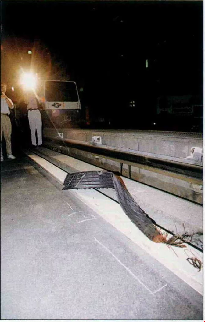 The testing of the MRT system has all been carried out under the public gaze, and every mishap has attracted media attention and sharp criticism. Our picture shows a tire burst incident in 1993. (photo by Tung Chun-fei)