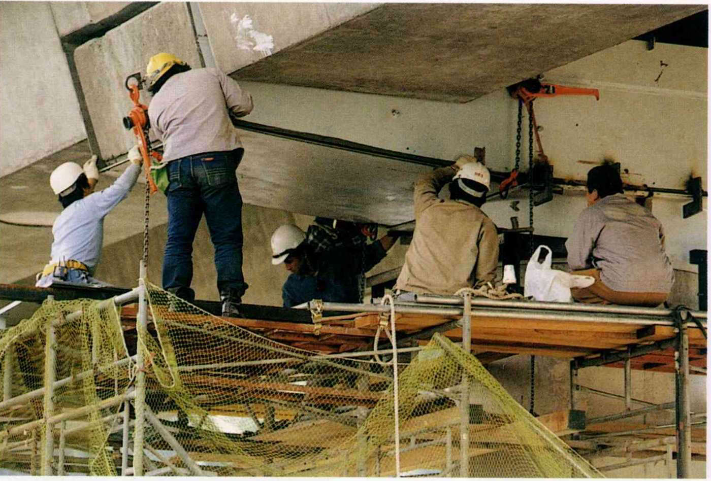 The problem of cracked cap beams has cast a shadow over the Mucha line. Here engineering workers are reinforcing a beam by sheathing it in steel plate. (photo by Tung Ch un-fei)