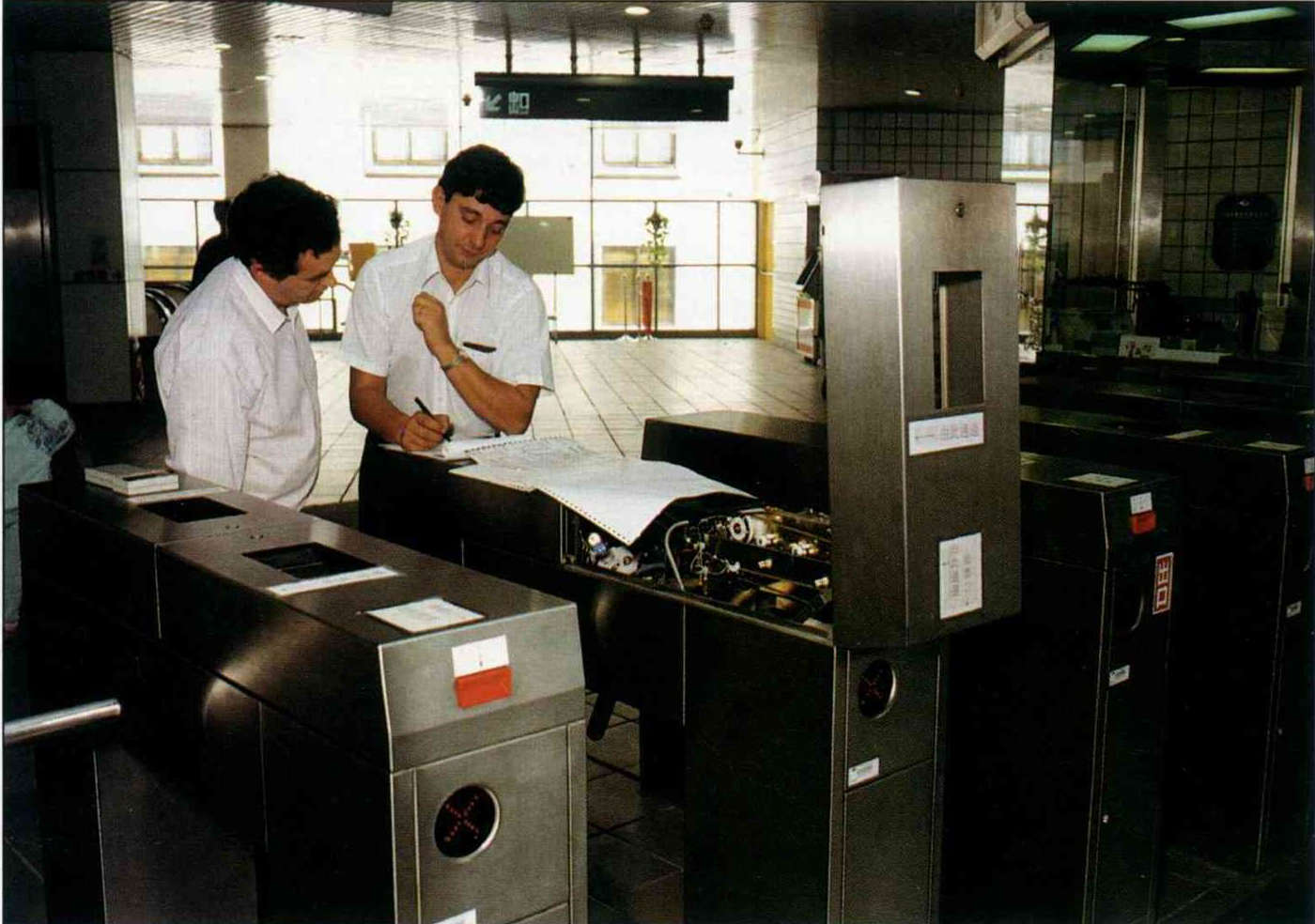 The strains of revenue service have brought many faults in the Mucha line to the surface. In our picture, two foreign technicians are carrying out emergency repairs to a ticket reading gate in one of the line's stations.